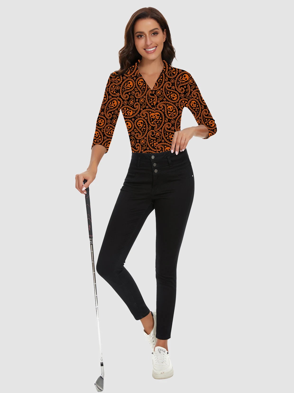 Celebrate Halloween with our Orange Skull V-neck Button-Down 3/4 Sleeve Shirt. The moisture-wicking fabric keeps you cool and comfortable, while the 4-way stretch ensures maximum flexibility. The spooky skull design adds a touch of playfulness to any Halloween celebration.