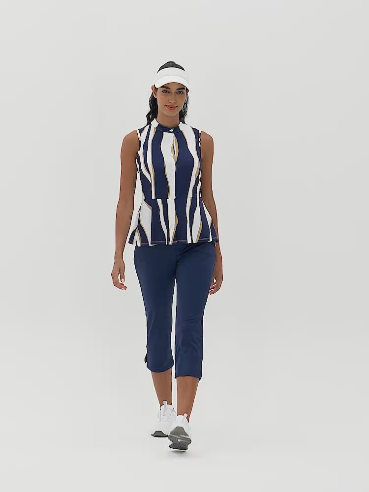 Stay cool and look chic in our Striped Sleeveless Peplum Top. Featuring a stylish stand collar and a button-down design, this shirt offers a polished look for any activity. The breathable, 4-way stretch fabric ensures maximum comfort and freedom of movement for sports like golf, tennis, or pickleball. The flattering peplum hem adds a touch of elegance for seamless day-to-night wear.