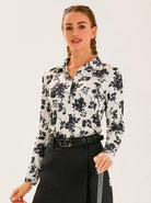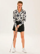 Black Floral on Light Yellow Background Long-sleeve Golf Polo Shirts for Women