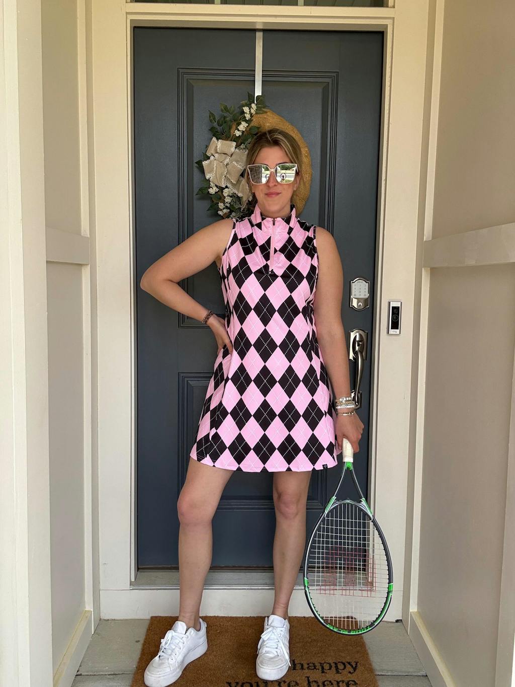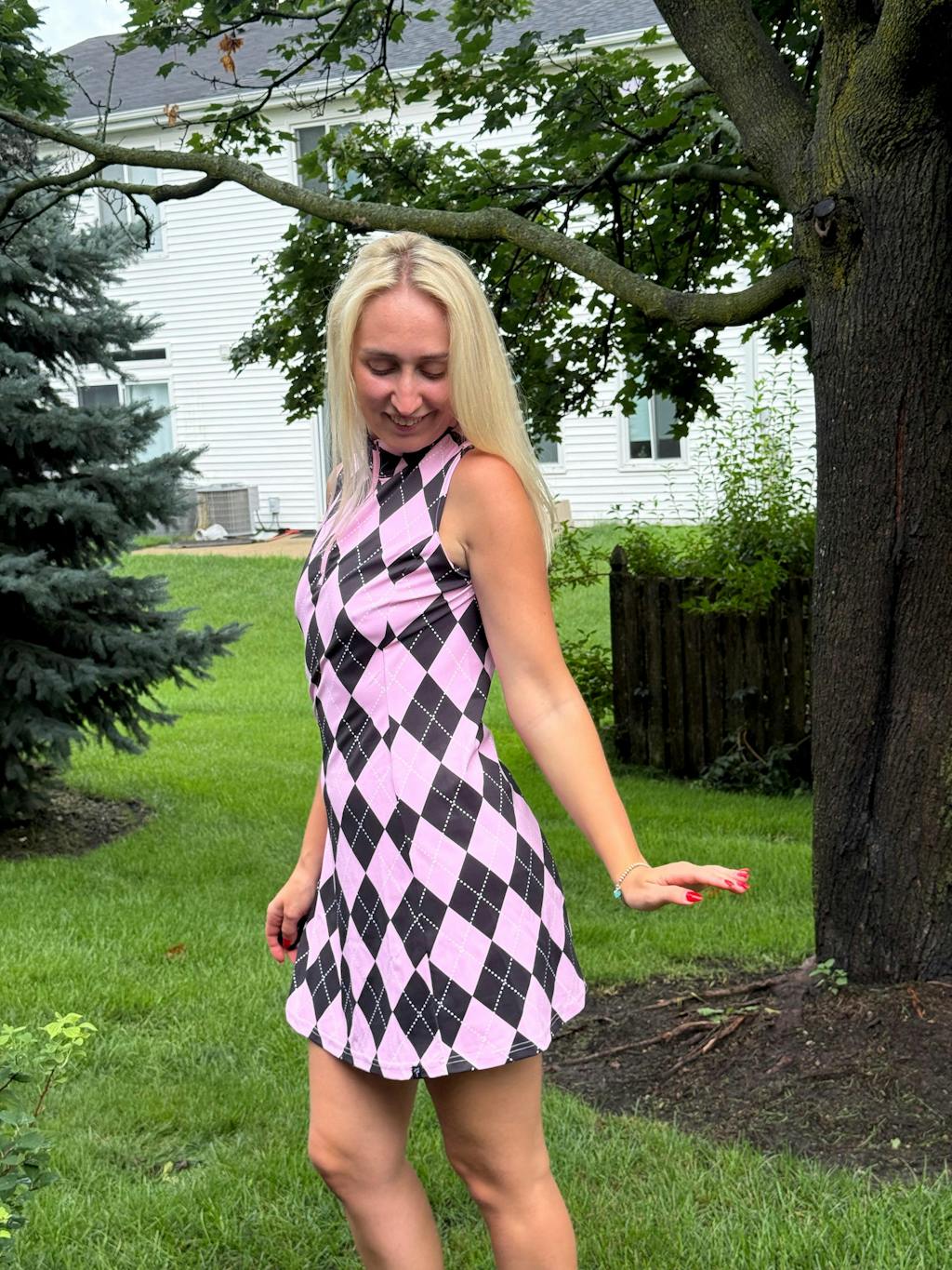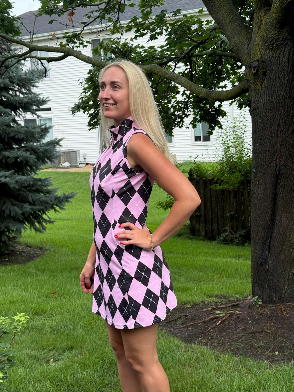 This versatile dress is perfect for a variety of activities, from golf and tennis to everyday outings. It's designed with a moisture-wicking fabric that keeps you cool and dry, while the soft and breathable material allows for comfortable movement. Plus, the convenient pockets make it easy to store your phone or other small essentials. With a stylish pink and blue checkerboard print and a flattering quarter-zip collar, this dress is a must-have for any active wardrobe.