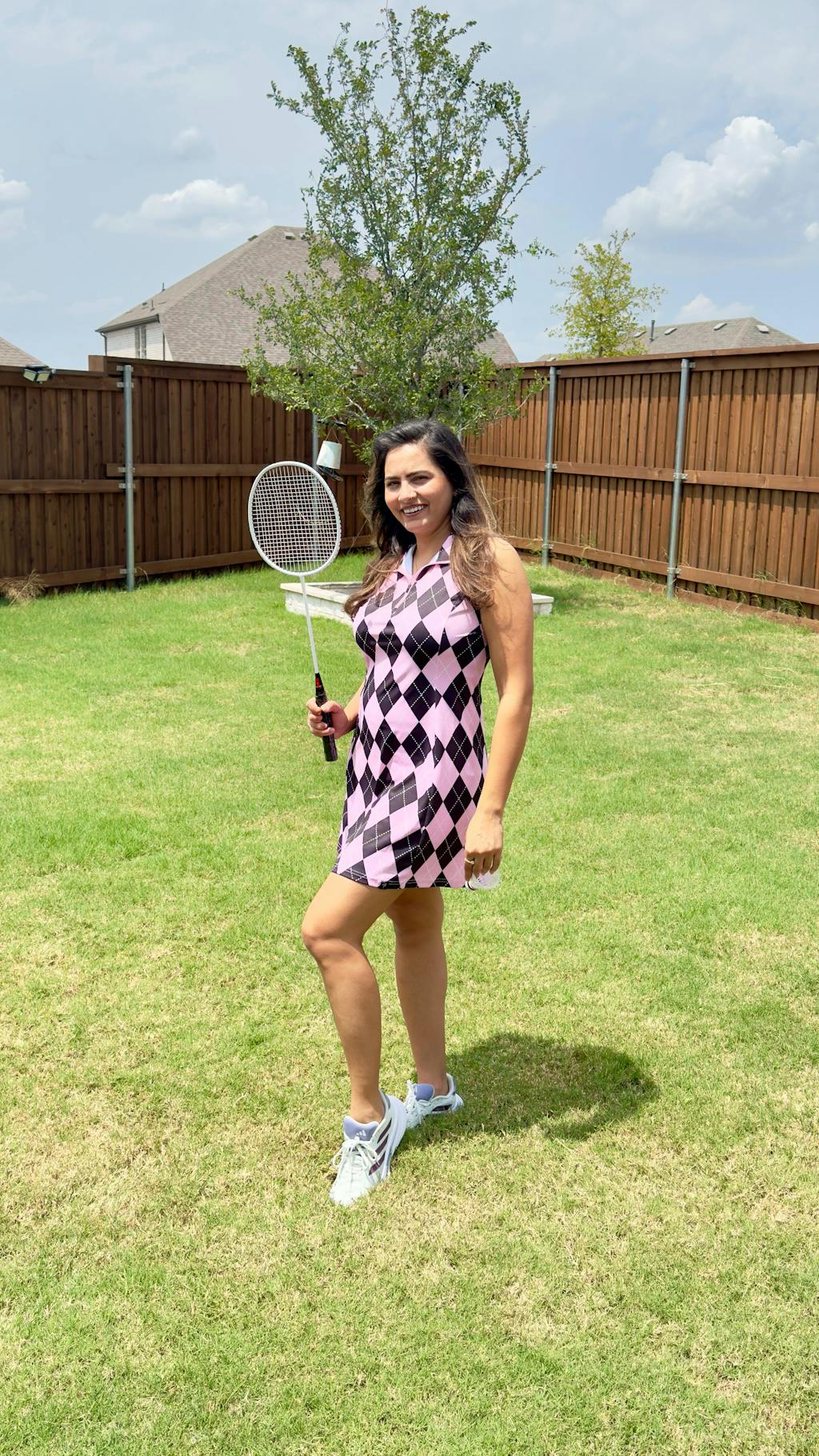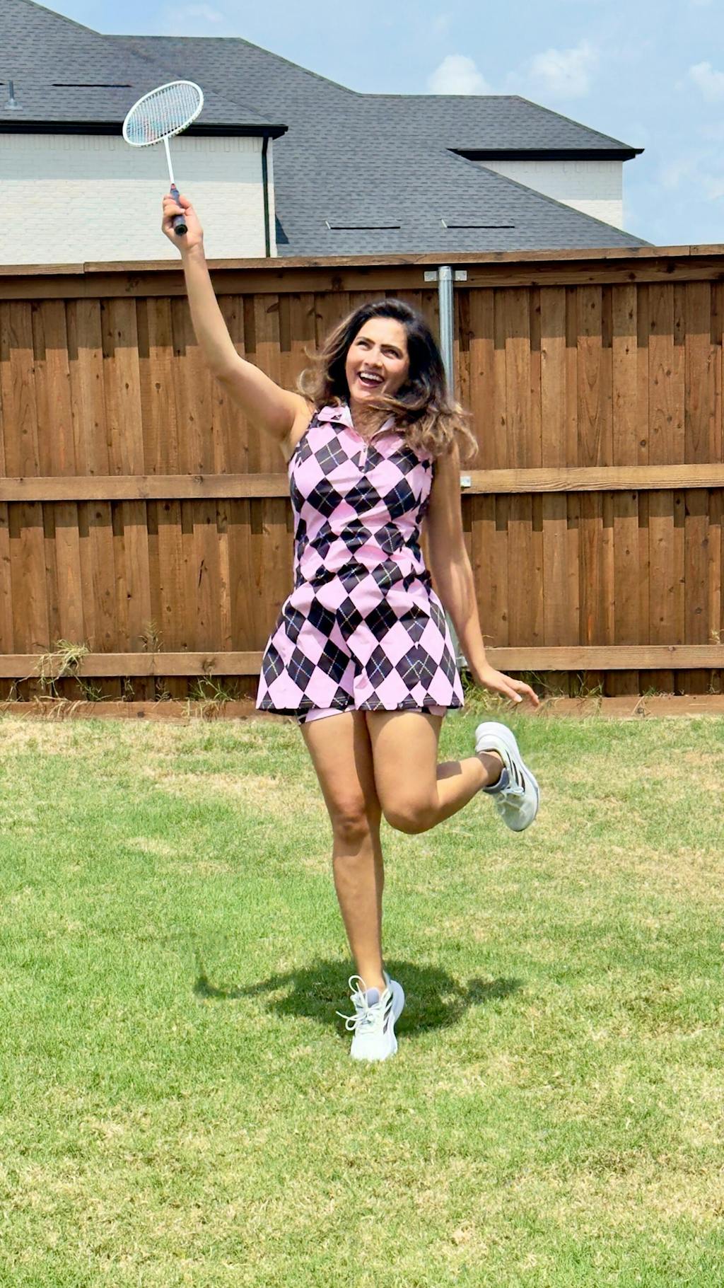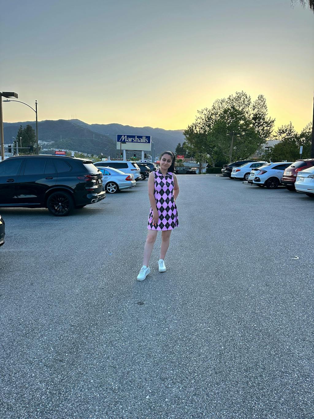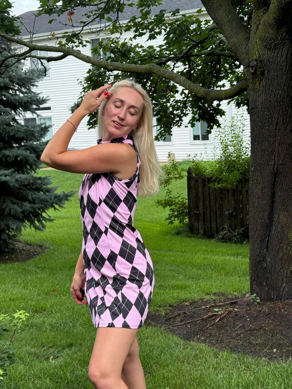 This versatile dress is perfect for a variety of activities, from golf and tennis to everyday outings. It's designed with a moisture-wicking fabric that keeps you cool and dry, while the soft and breathable material allows for comfortable movement. Plus, the convenient pockets make it easy to store your phone or other small essentials. With a stylish pink and blue checkerboard print and a flattering quarter-zip collar, this dress is a must-have for any active wardrobe.