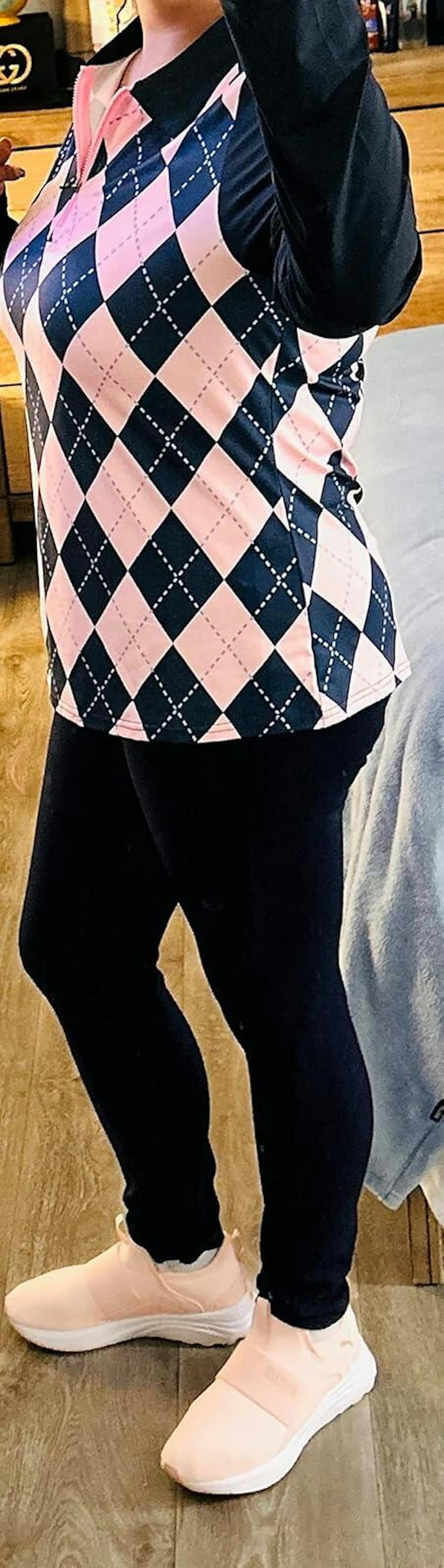 Embrace confidence in this striking blue-and-pink checkerboard polo, thoughtfully designed to support your active lifestyle. The four-way stretch fabric moves seamlessly with you, while advanced moisture-wicking keeps you comfortable through every swing, serve, and stride. Soft and gentle against your skin, the quarter-zip collar and long sleeves provide a polished, put-together look you can rely on.