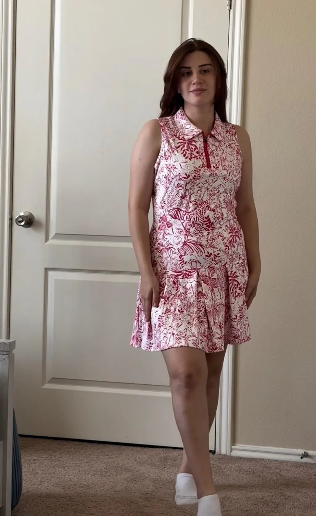 Pink Wildlife Print 34" Quarter-zip Sleeveless Pleated Dress with Shorts