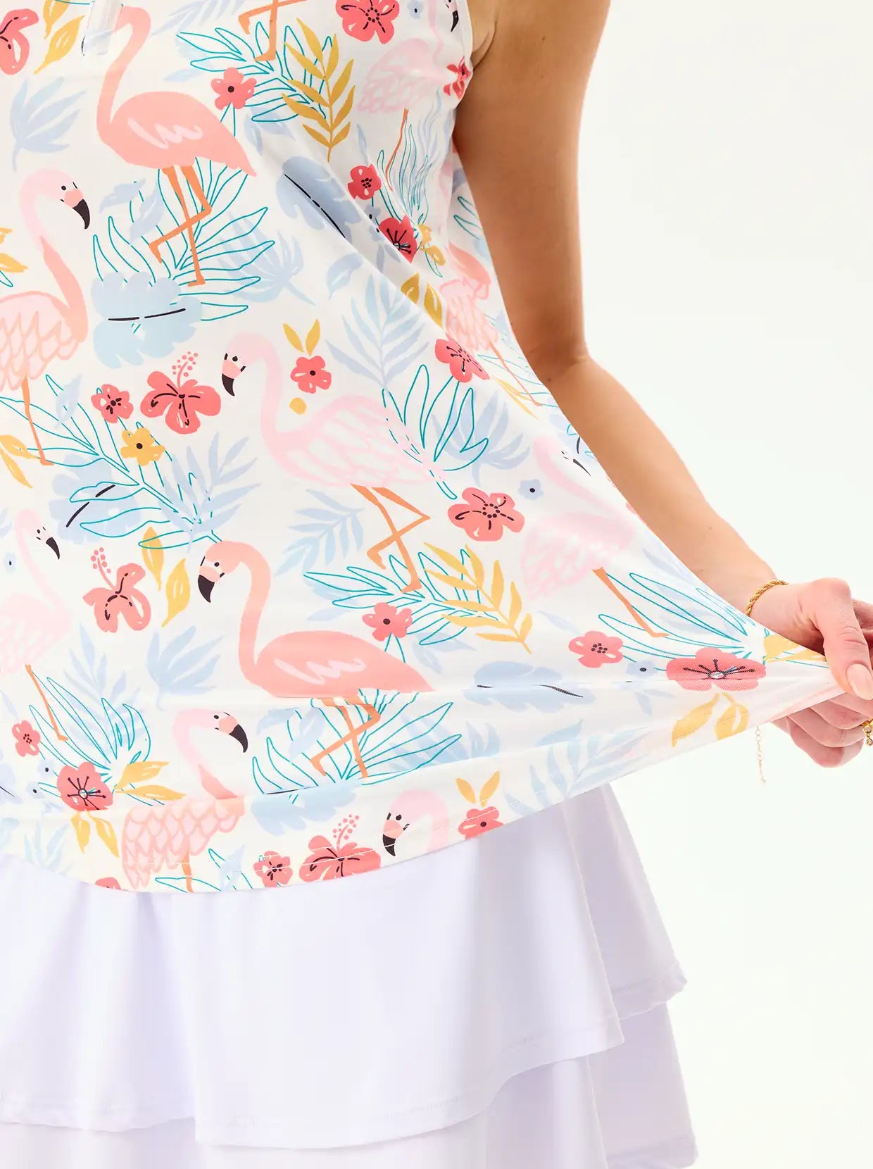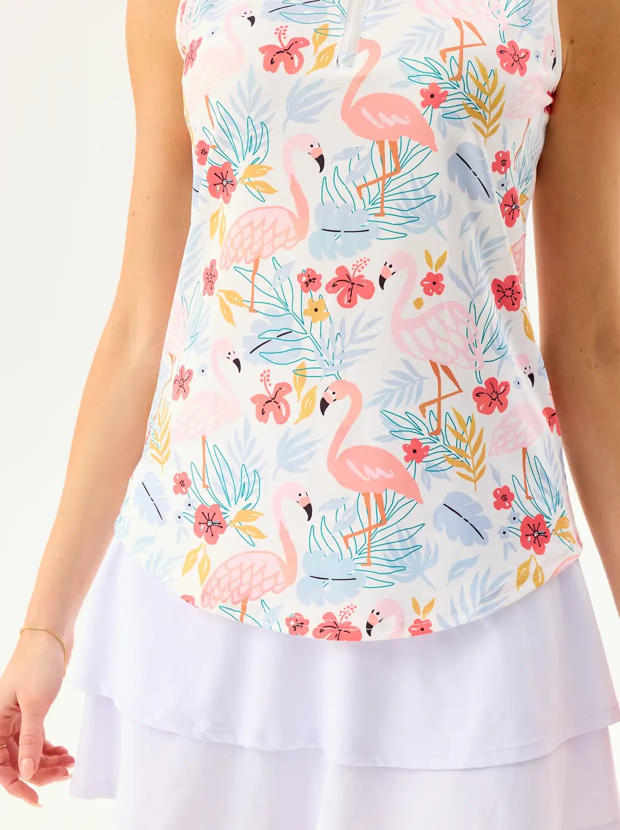 Ignite your game with our Pink Flamingo Quarter-Zip Sleeveless Polo. Designed for confidence, its 4-way stretch and sleeveless cut ensure total freedom of movement. Stay cool and dry thanks to moisture-wicking fabric and maximum breathability, perfect for hot days. Featuring a unique feeding flamingo print on a white background, you'll stand out on any course or adventure!