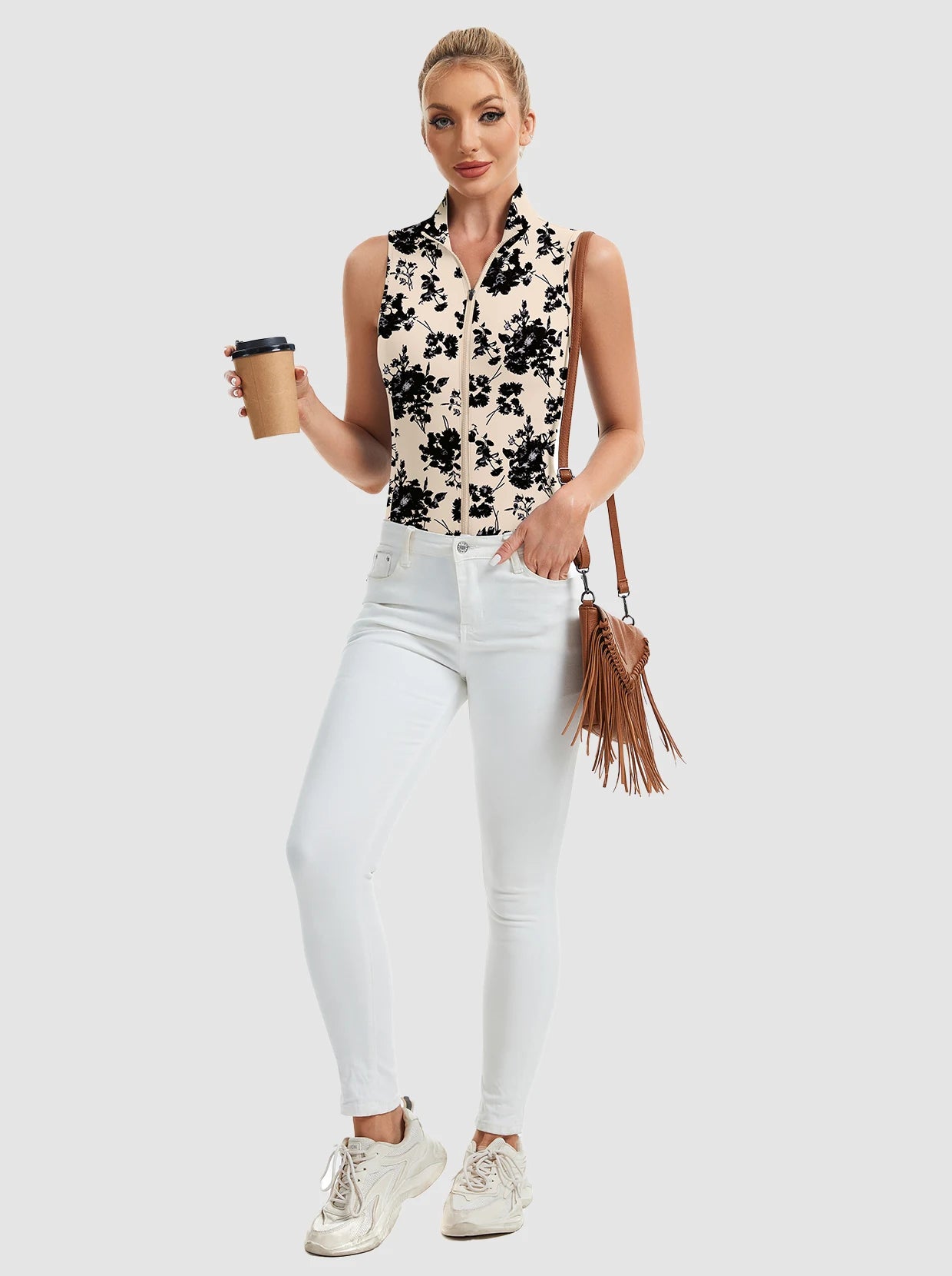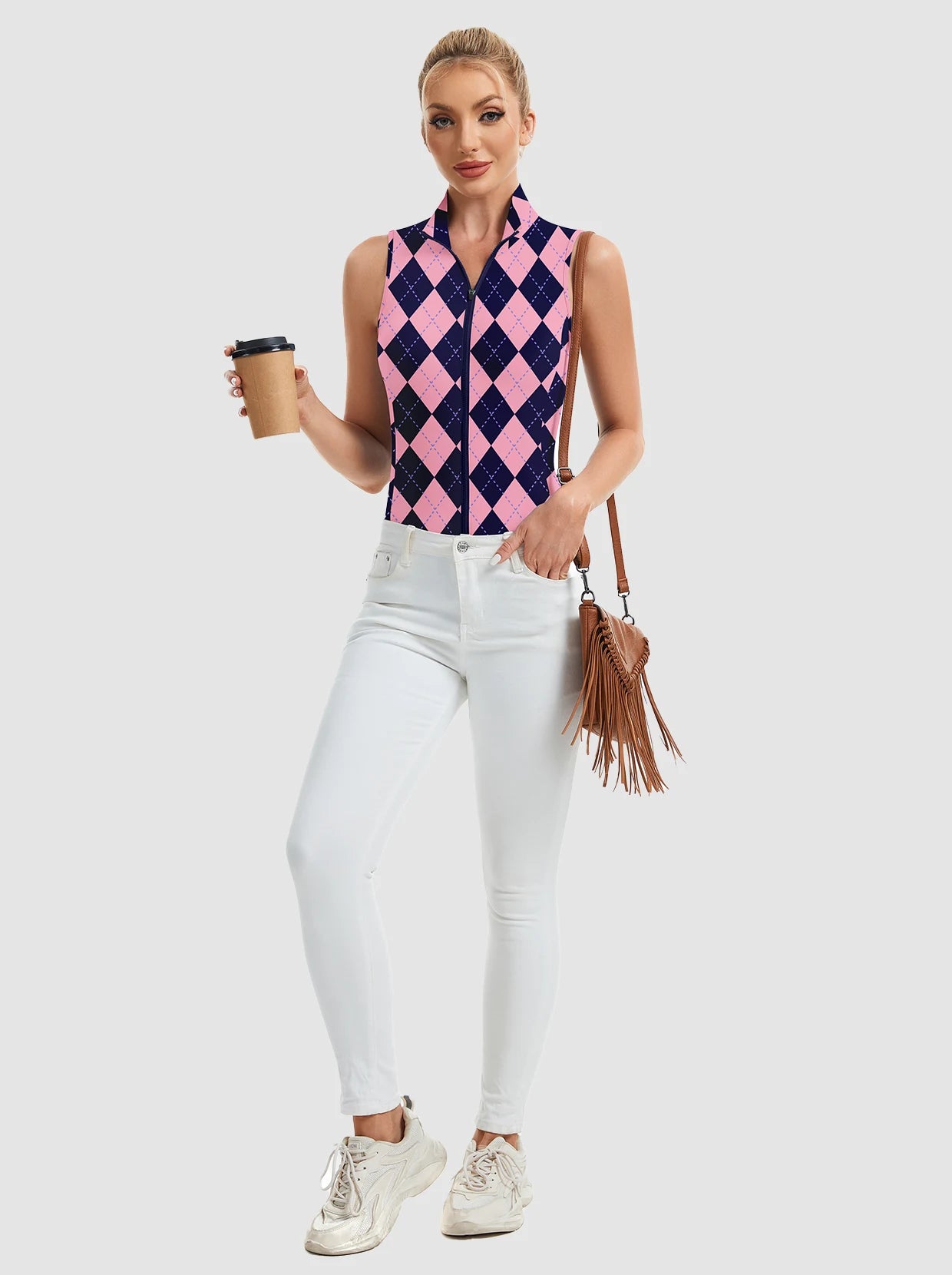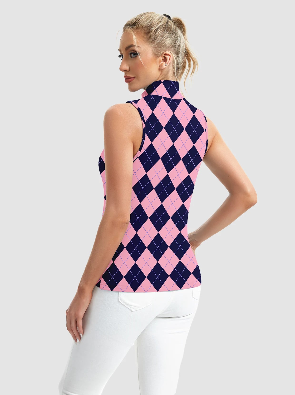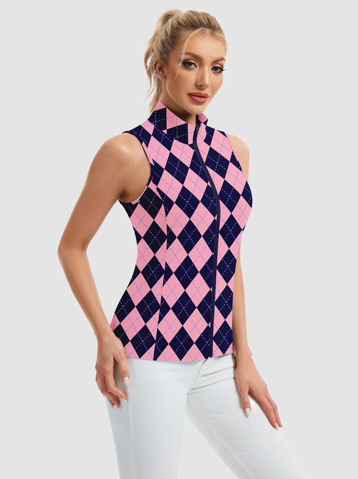 Unleash fierce style and peak performance with our printed Stand-collar Sleeveless Polo. The striking print and full-zip stand collar make a bold statement. Crafted from 4-way stretch, soft, moisture-wicking, breathable fabric, it ensures comfort and dryness. Its sleeveless design offers maximum movement for golf, tennis, pickleball, or turning heads daily. Elevate your active wardrobe with this daring, versatile piece!