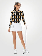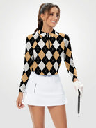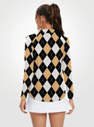 Brown and Black Checkerboard Quarterzip Long-sleeve Polo Shirt for Women