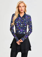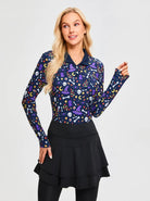 Add a touch of Halloween flair to your everyday wardrobe with our purple long-sleeve polo tops. The soft, breathable material ensures all-day comfort, while the 4-way stretch allows for maximum movement. The classic v-neck and two-snap buttons offer a versatile look, and the skull graphic adds a playful and festive touch.