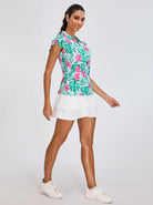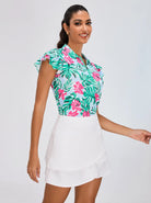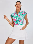 Step up your game with our Red Floral Quarter-zip Ruffled Short-sleeve Polo Shirt. Featuring a vibrant floral print, this polo top is not only stylish but also functional. The breathable fabric wicks away moisture to keep you comfortable, while the 4-way stretch allows ultimate flexibility. The quarter-zip collar adds a touch of sophistication, and the ruffle sleeves give a feminine touch. Whether you're playing golf, tennis, or pickleball, or just looking for a casual yet chic outfit, this shirt has got you covered.