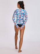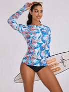 Blue and Green Leaves Quarter-zip Long-sleeve Rash Guard with Thumbhole