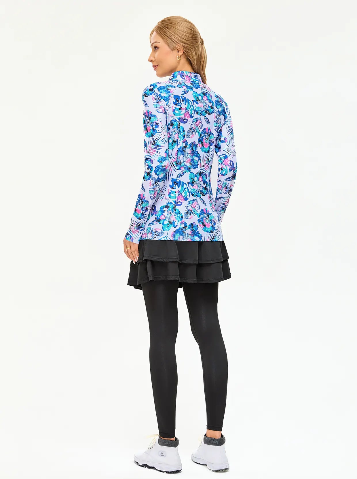 You can pair a women's golf shirt with a variety of bottoms, depending on the occasion. Golf skirts, shorts or tailored trousers are perfect for a day on the course. For a sporty yet stylish look, pair a printed golf shirt with a short skirt or slim-fitting golf pants. Accessories like a sunhat or visor not only complete the look but also protect you from the sun, while a light jacket or pullover can keep you warm without sacrificing style.