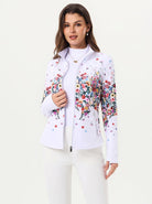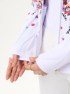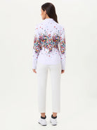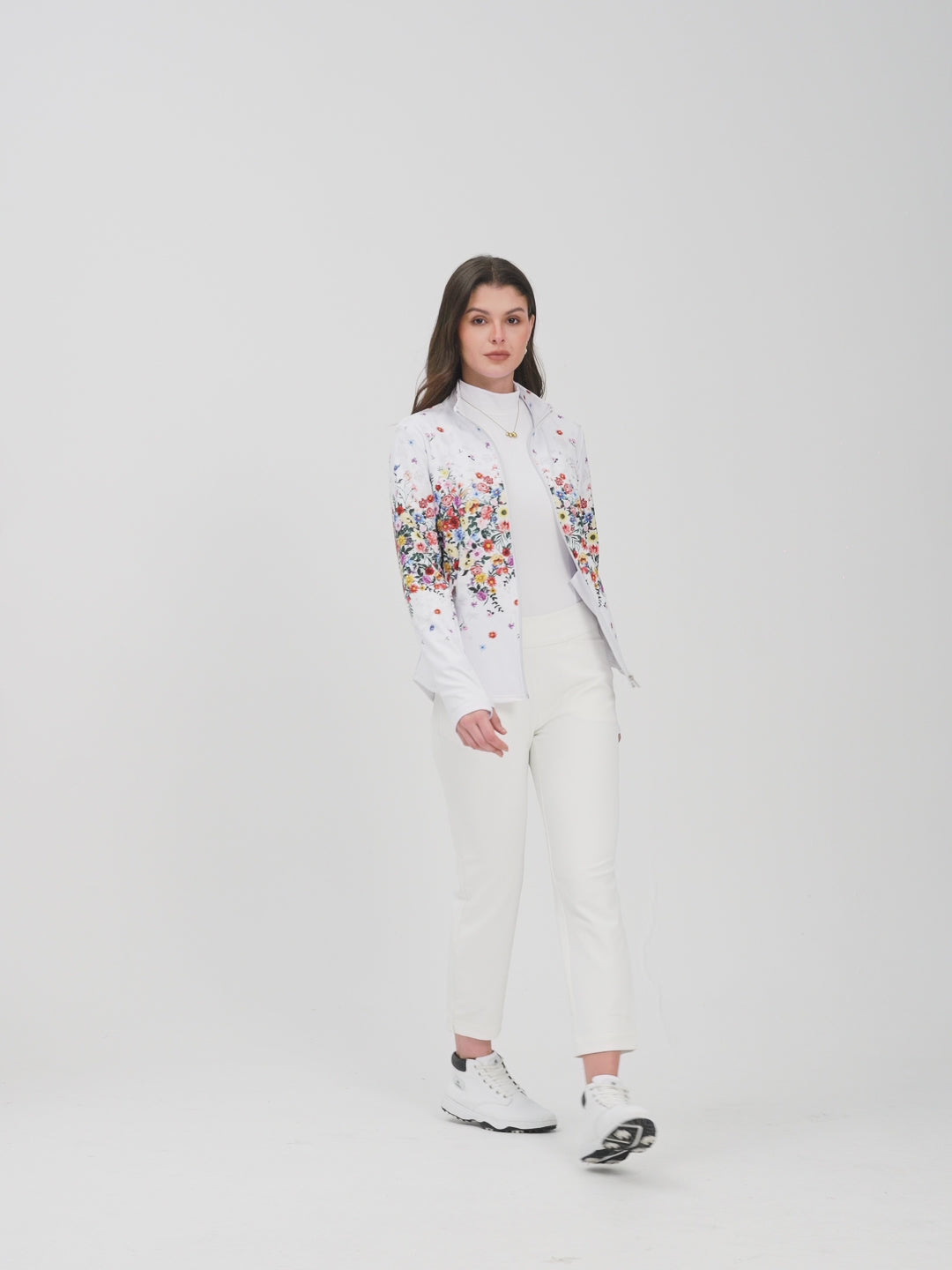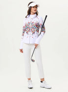 Stay warm and stylish on the course with our vibrant floral golf jacket. The stretchy thermal fabric moves with you while delivering lightweight warmth, and the full zip makes layering effortless. Thumbhole sleeves lock in heat and keep your hands cozy, while two secure pockets hold your essentials. Playful florals pop against a crisp white base—golf just got more fun.