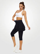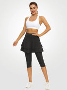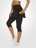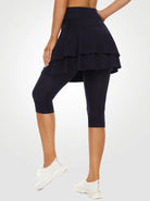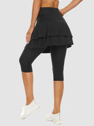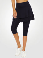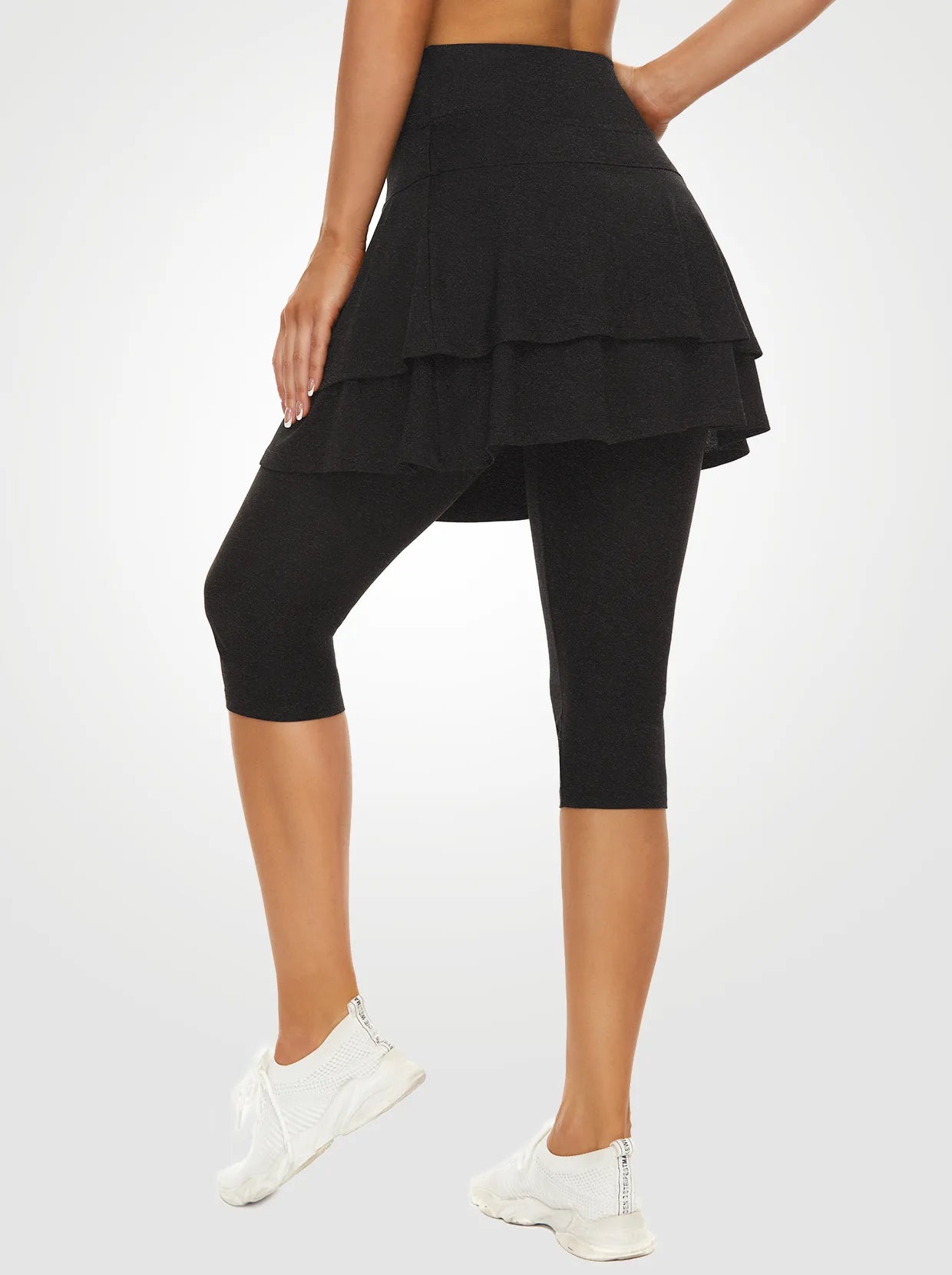 Our Basic Double-Layer Knee-Length Skirted Leggings combine style and performance. Perfect for outdoor sports or daily wear, they feature moisture-wicking, breathable fabric to keep you comfortable and dry during intense activities. The skirted design and 4-way stretch material offer freedom of movement. With double-layer ruffles, side pockets, fast-drying fabric, and a wide waistband, they ensure comfort and practicality for active days.