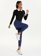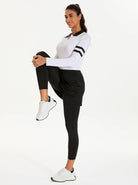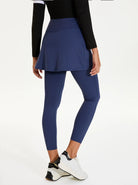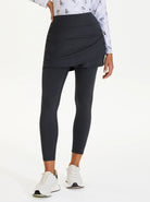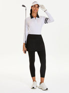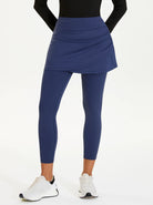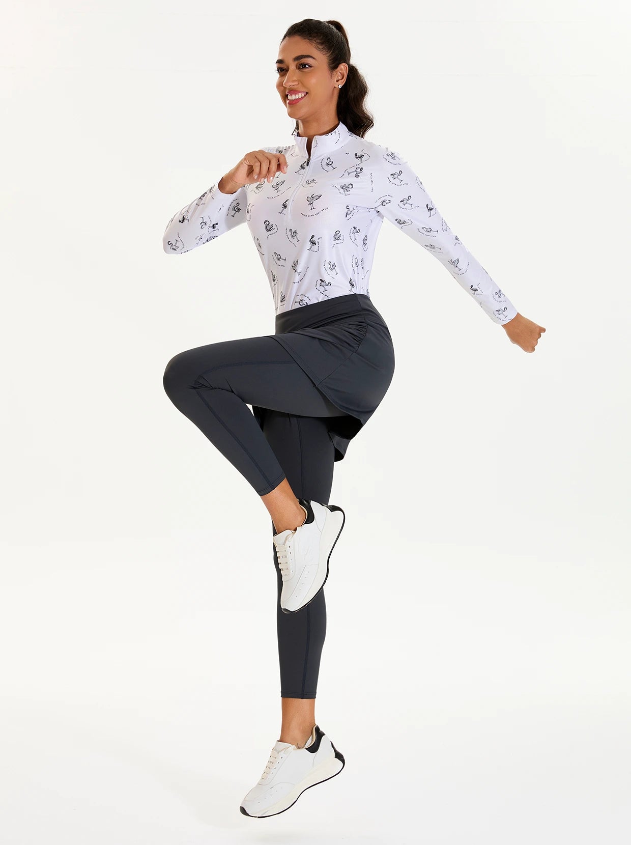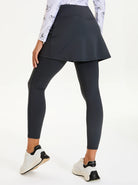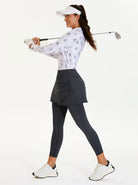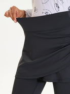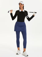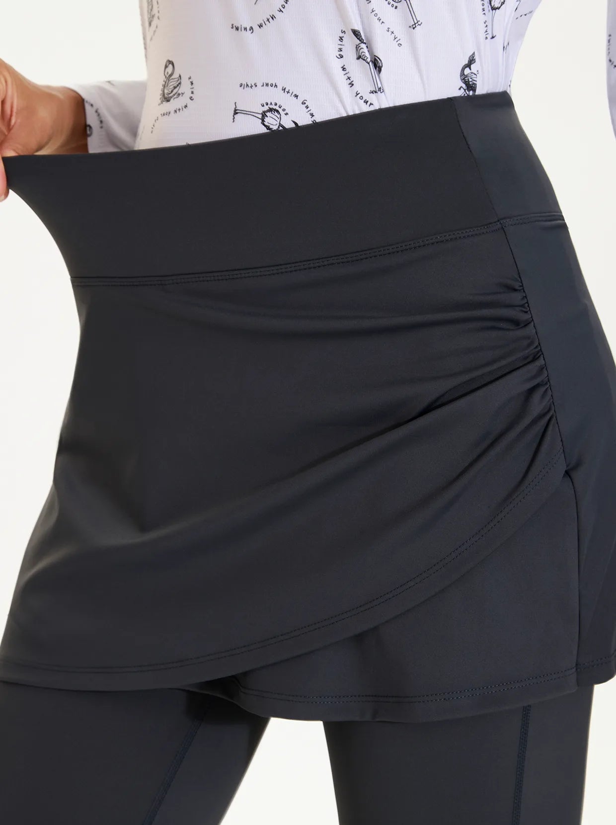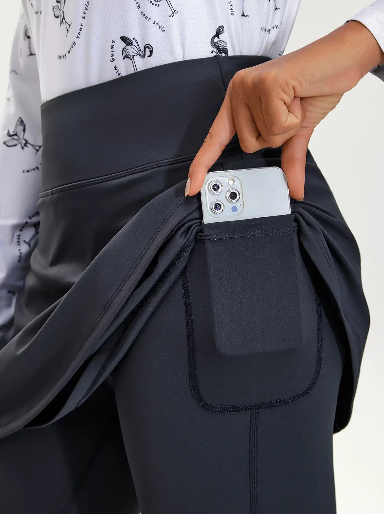 Move with confidence in our cropped leggings with a playful crossover hem and pleated skirt. Designed for both style and performance, they feature a comfortable elastic waistband and handy inner pockets. The fabric offers 4-way stretch and is both moisture-wicking and breathable. Available in black, blue, and grey, they're perfect for golf, tennis, pickleball, or everyday wear.