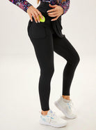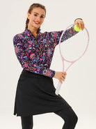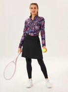 Designed for comfort and performance, the black skirted leggings feature a lightweight, breathable fabric that wicks away moisture to keep you cool and dry. The elastic waistband provides a secure fit, while the split hem and knee-length skirt offer more range of motion and an elegant look. With built-in leggings and four pockets, it is perfect for tennis or casual wear.