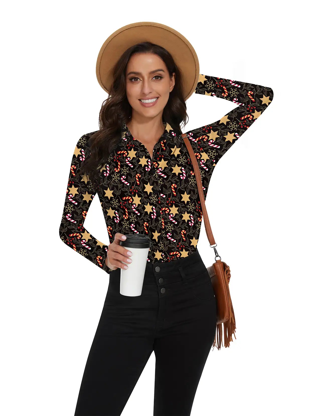 Christmas Golden Star Long-sleeve Polo Shirt for Women