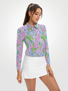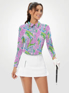 Green and Pink Leaves Quarter Zip Long-sleeve Polo Shirt for Women
