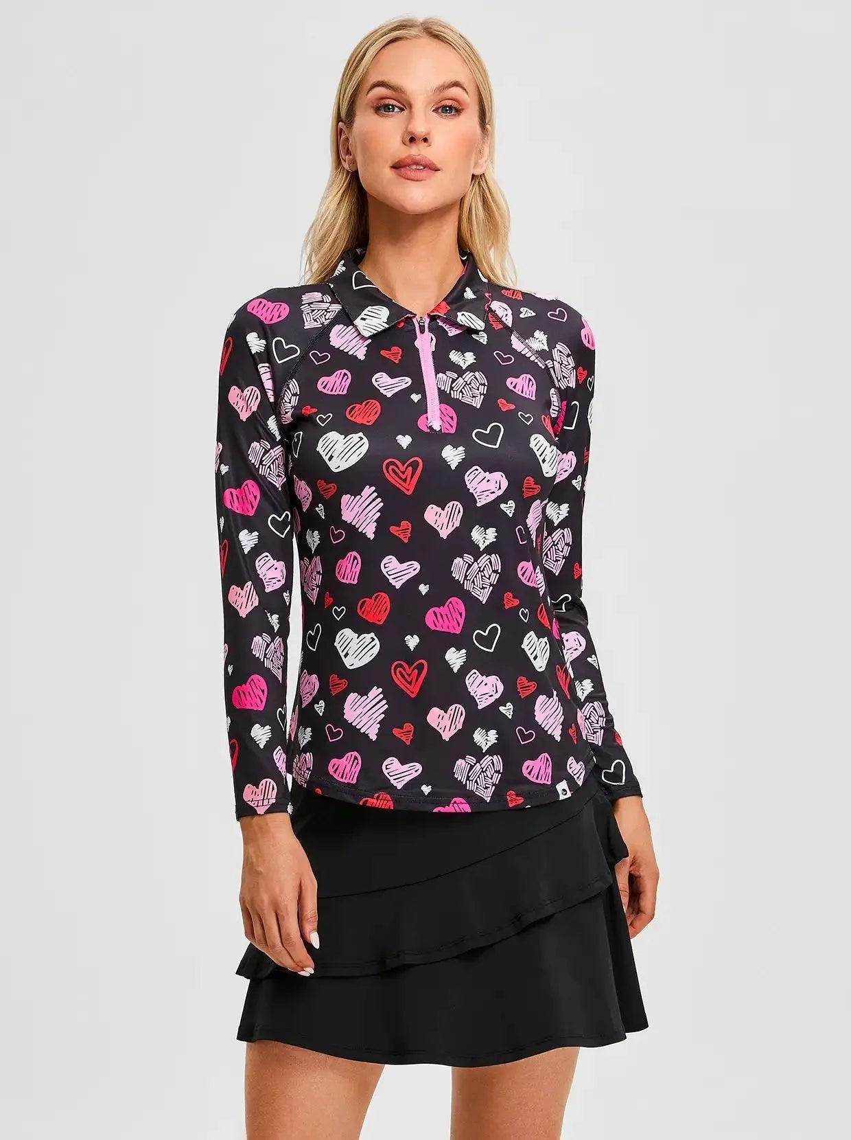 Colorful Heart Quarterzip Long Sleeve Polo Shirt for Women