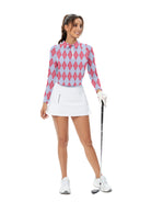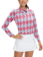 Ladies Long Sleeve Golf Polo- Pink and Purple Checkerboard Raglan Quarter Zipper Moisture Wicking Quick Dry Athletic Workout Striped Polo Golf Shirt Tennis Shirt