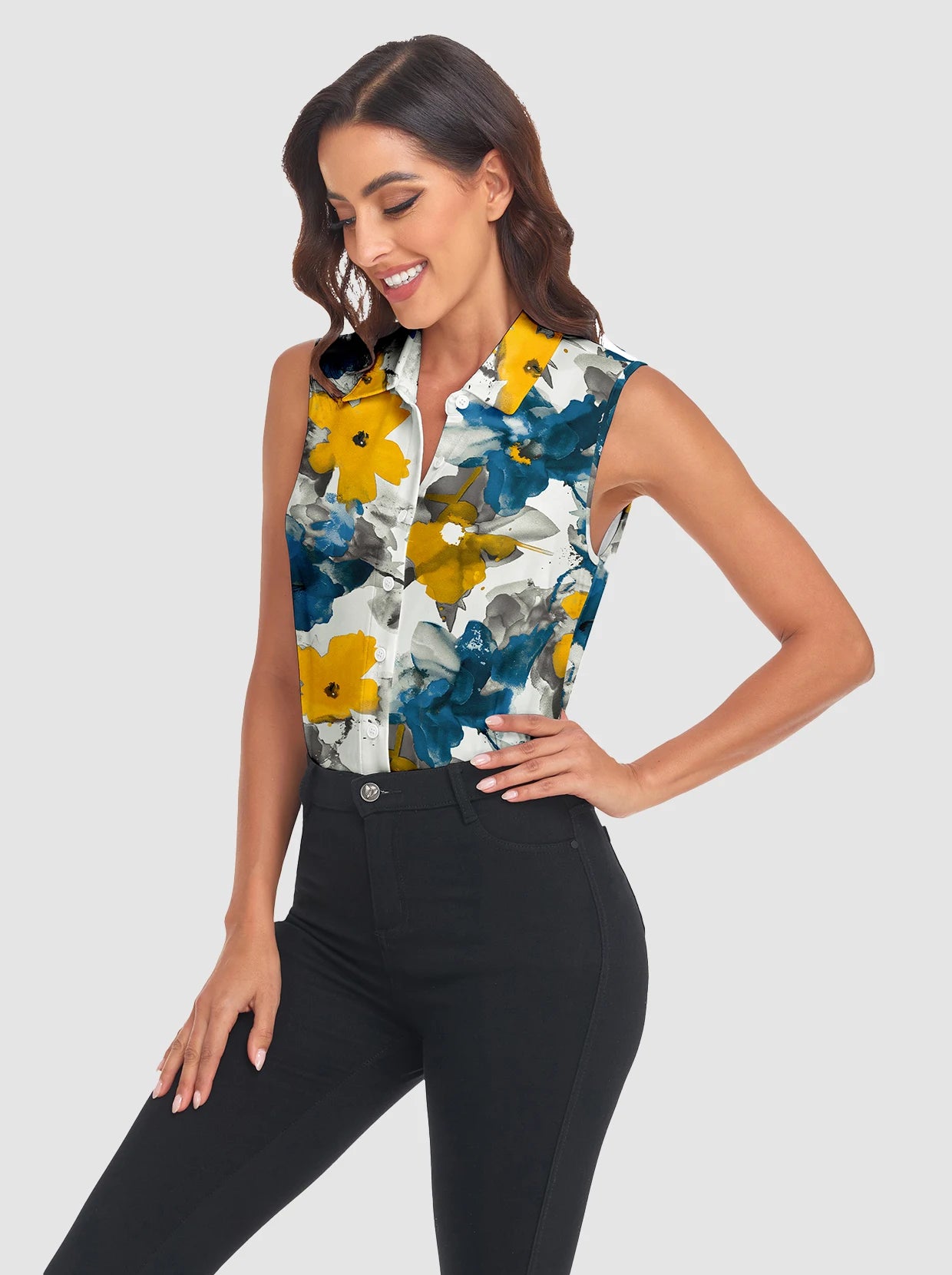 Button-Placket Ruffled Sleeveless Polo Shirt for Women