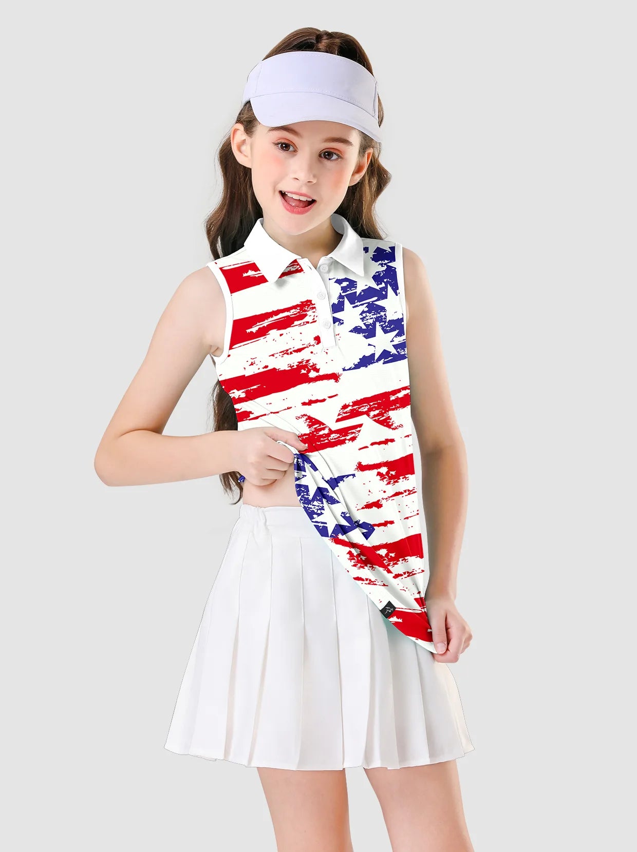 Keep your girl comfortable and stylish with our Artistic Flag Pattern Button-placket Sleeveless Polo. Made with quick-dry, breathable, and stretch material, our girls' sleeveless top is perfect for outdoor activities and daily wear. The flag print adds a touch of fun and personality to any outfit. Available in sizes for ages 6-14, your child will look and feel fashionable while staying cool and comfortable. Upgrade your child's wardrobe with this must-have shirt today!