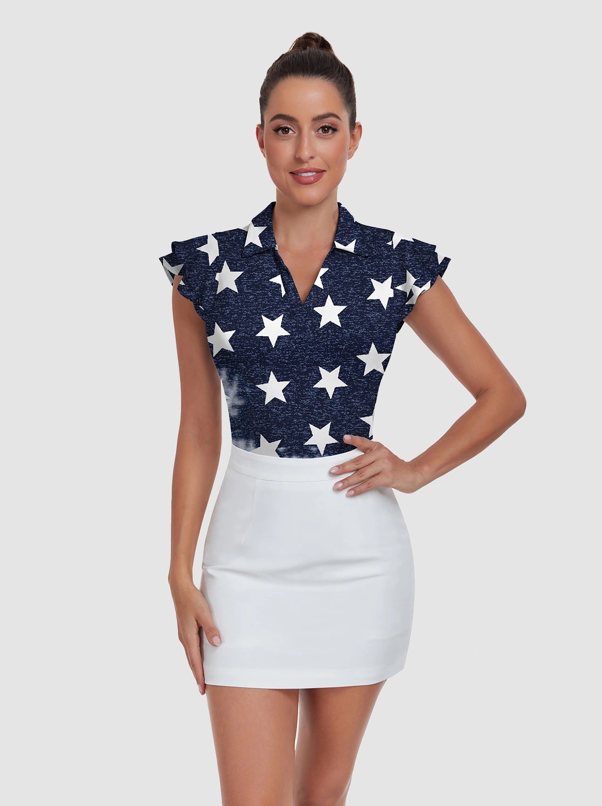 This stylish polo shirt features a unique blue leopard print design that is perfect for any occasion. Made with moisture-wicking, breathable, and soft material, it's comfortable to wear and helps keep you cool and dry. The 4-way stretch allows for maximum flexibility so you can move freely while playing golf, tennis, pickleball, or simply going about your day. The v-neck and ruffle sleeves add a touch of feminine charm to this versatile shirt.
