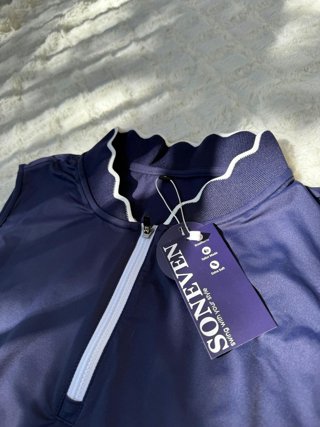 Stand out with a unique collar on this dark blue ruffled quarter-zip shirt. Made with durable, stretch fabric for unrestricted movement, this top is perfect for workouts and daily wear. The white contrast and curved hem add bold style while the sleeveless design keeps you comfortable. Available in solid blue and suitable for various sports and occasions.