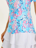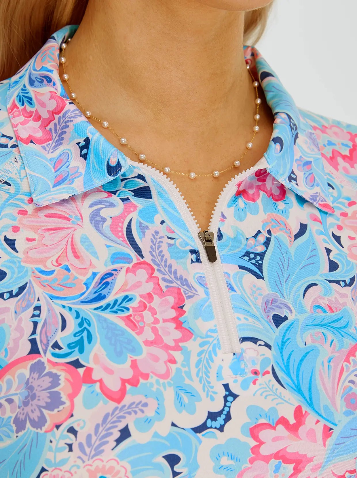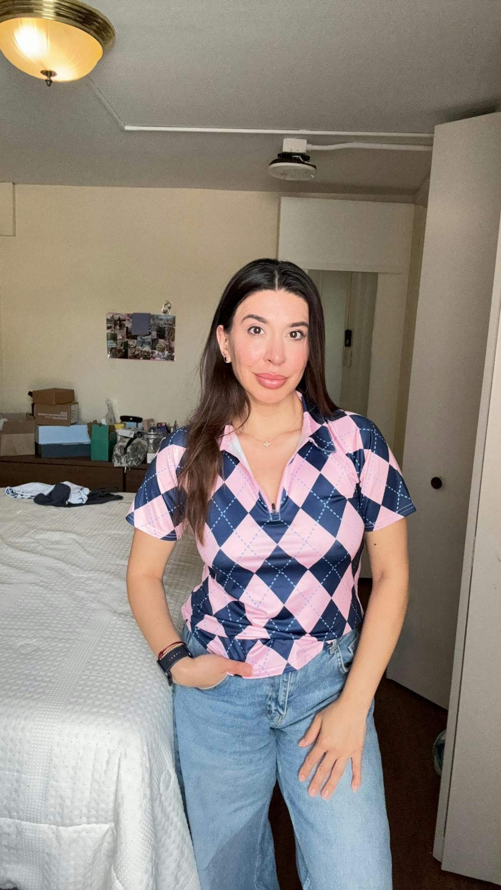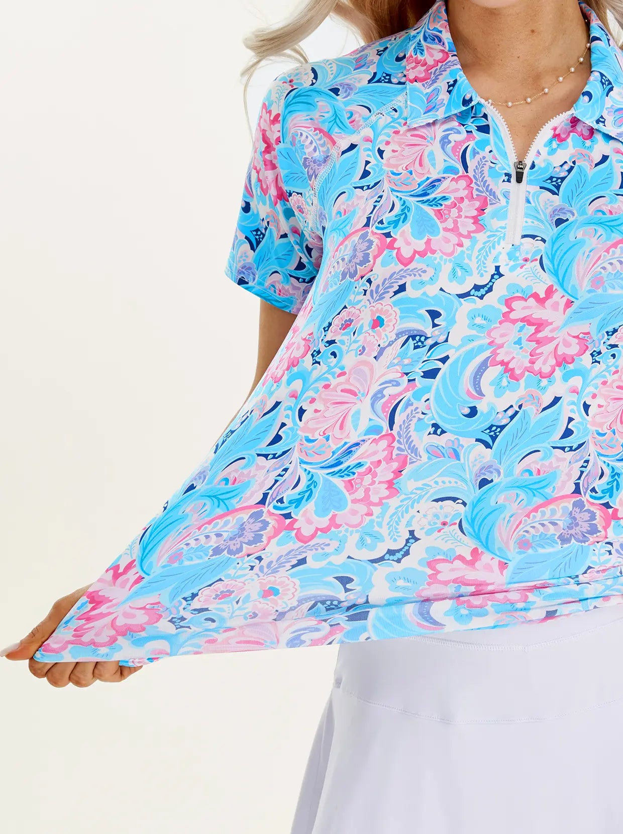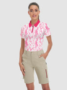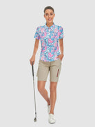 This golf polo features a playful pink and blue checkerboard design with a convenient quarter-zip feature, making it perfect for a round on the course. Stand out from the crowd with this fun and functional top, designed for comfort and style.