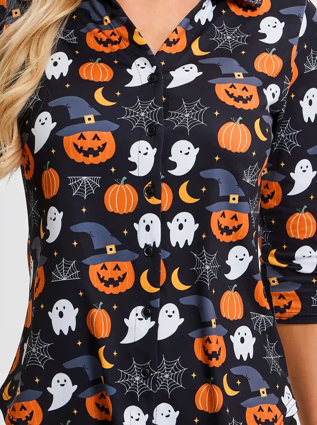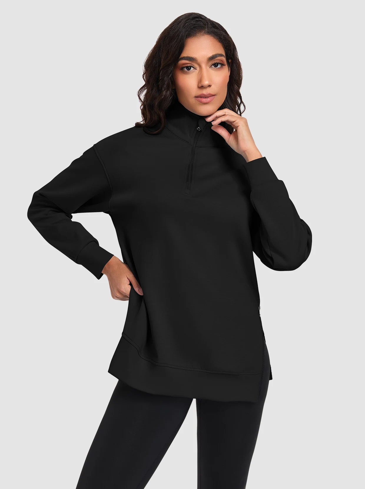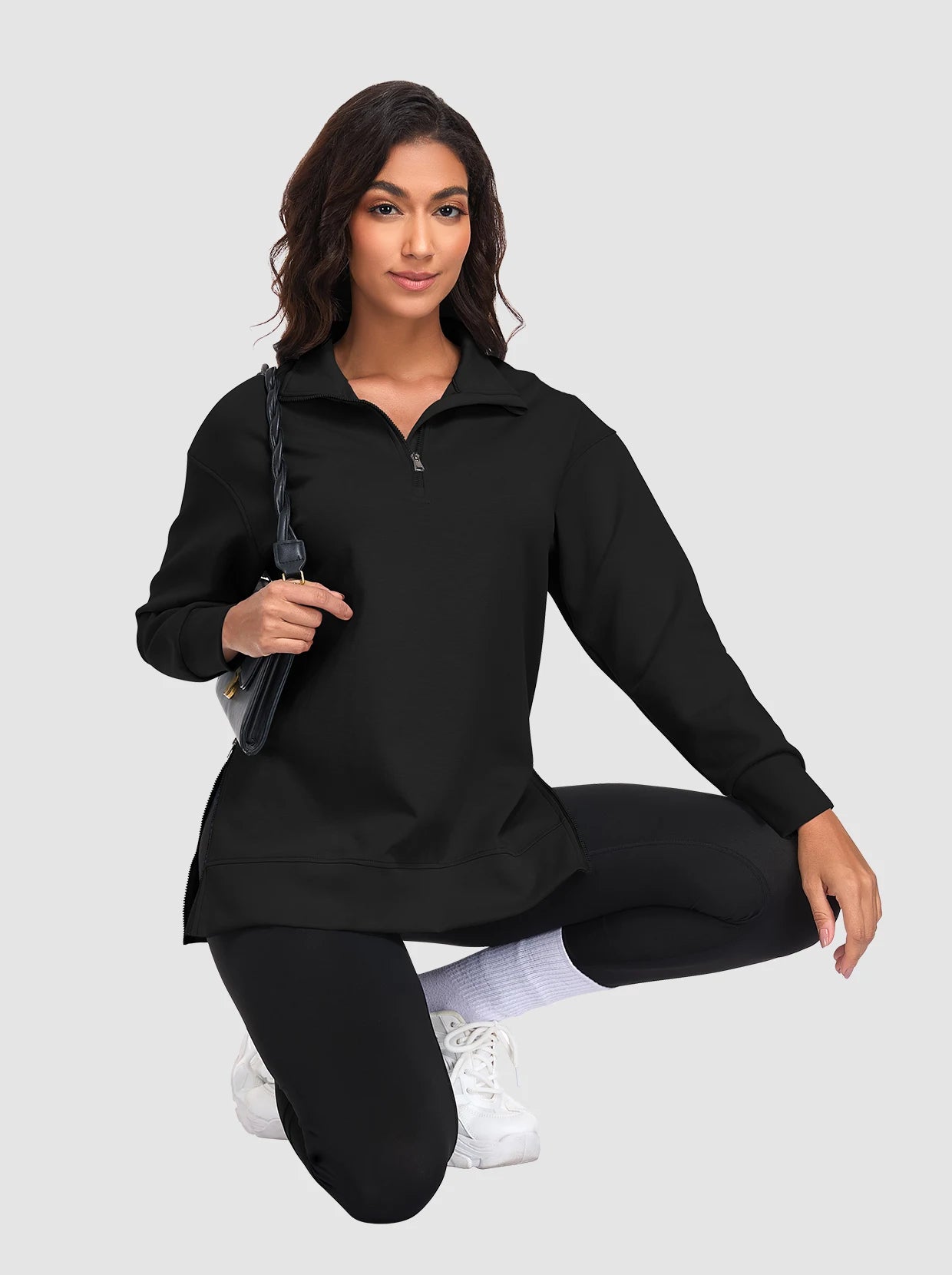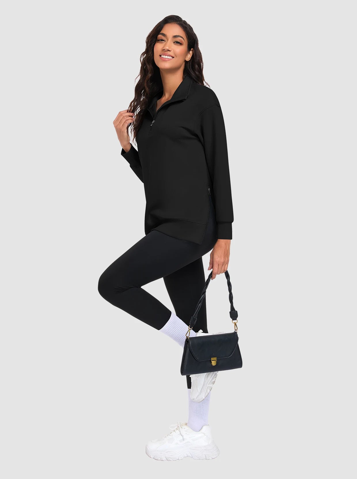 Solid Black Quarter-zip 3/4 Sleeve Shirt For Women