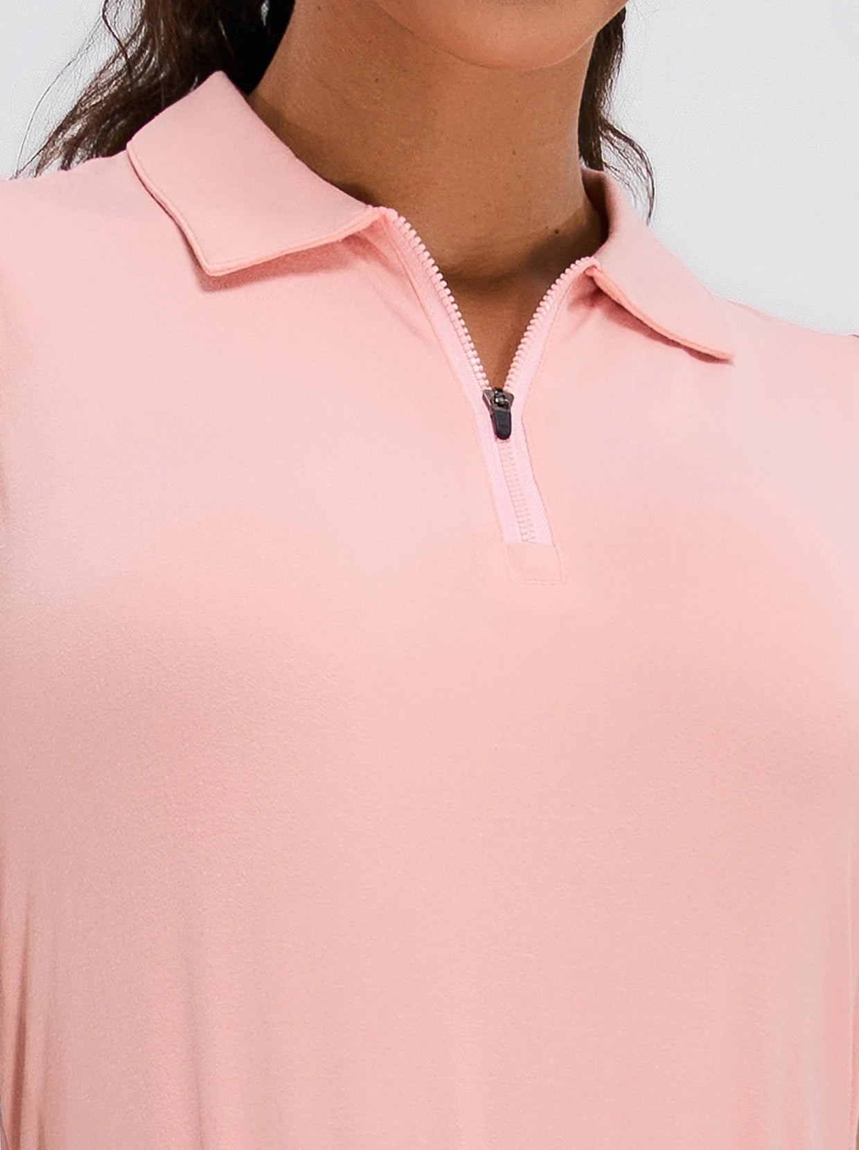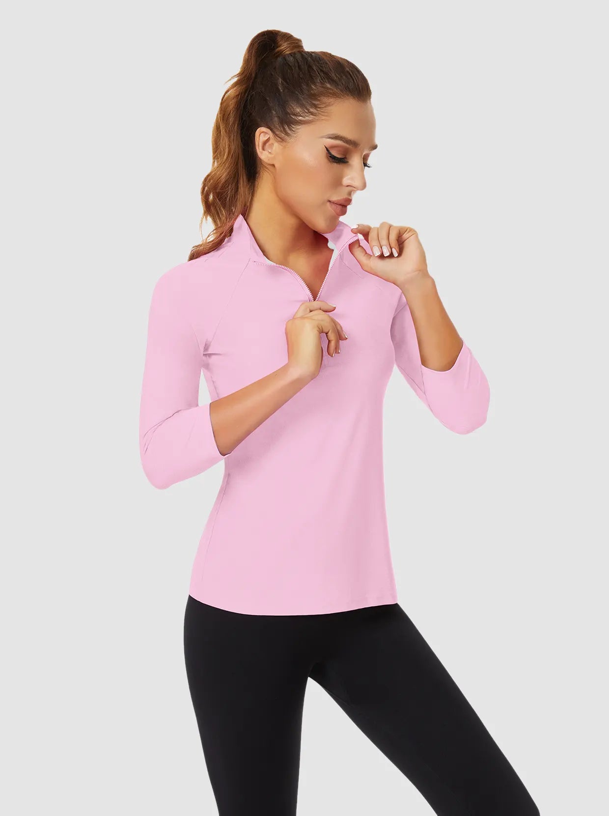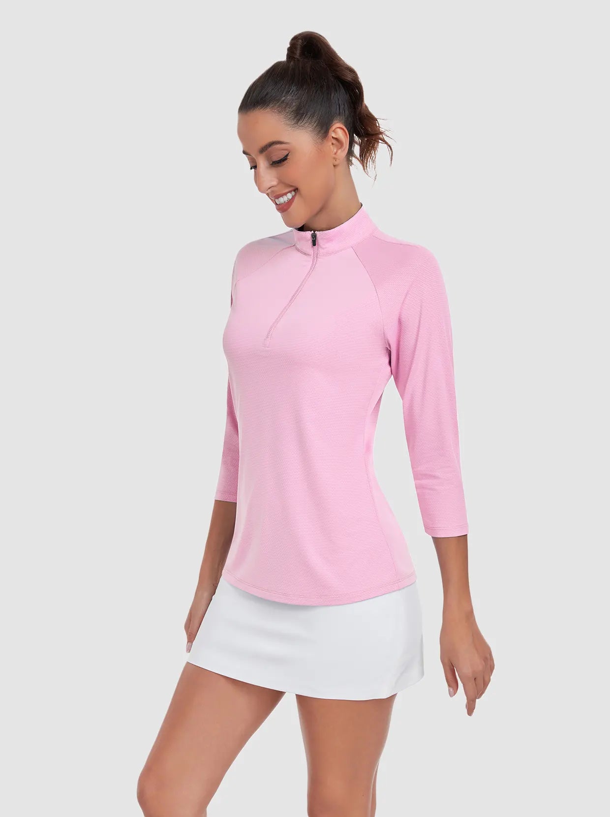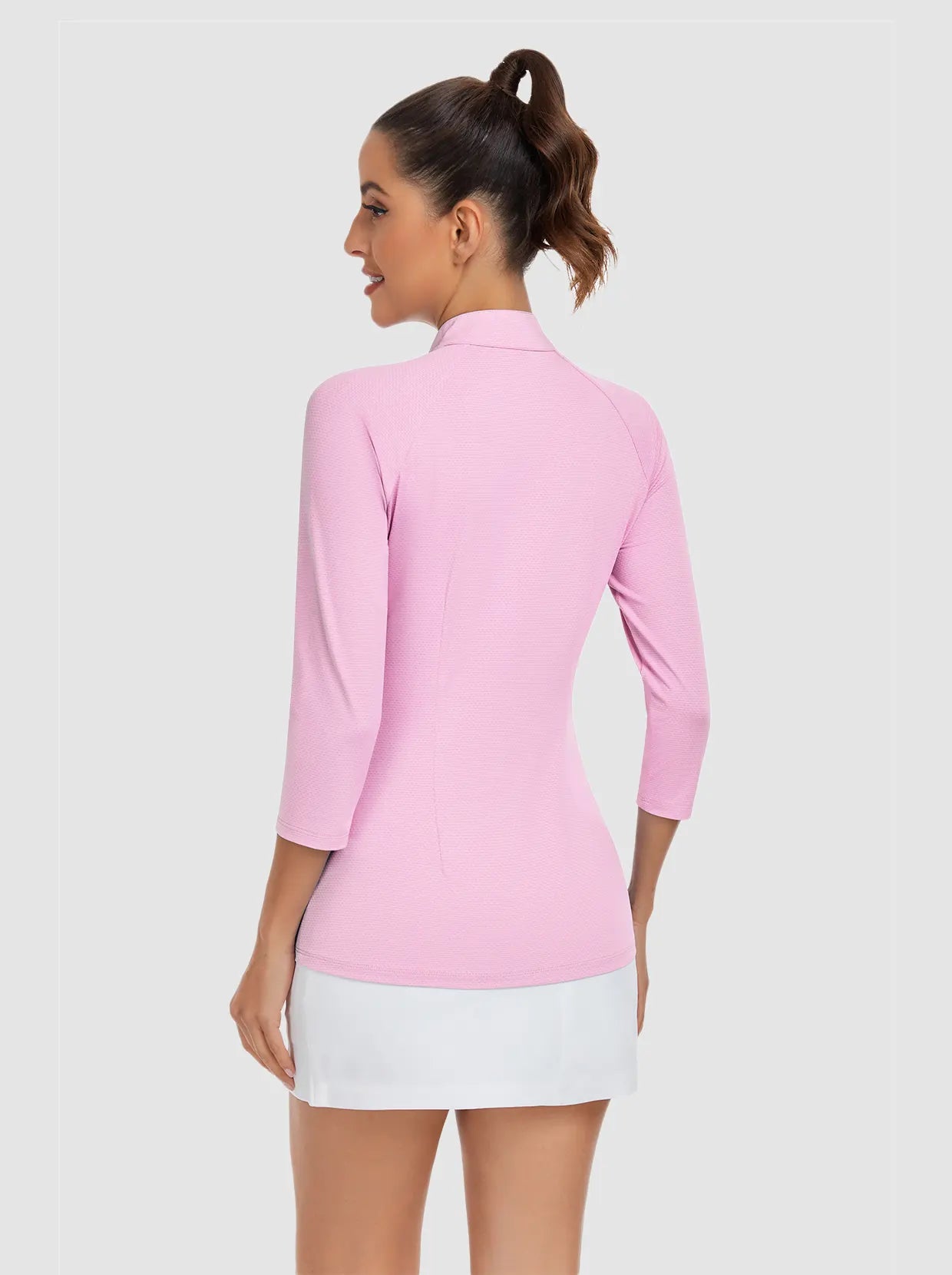 Solid Pink Quarter-zip 3/4 Sleeve Golf Shirt For Women