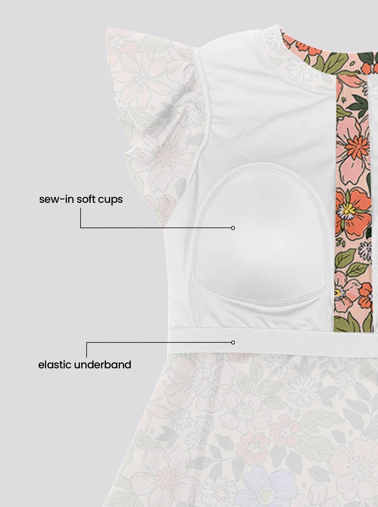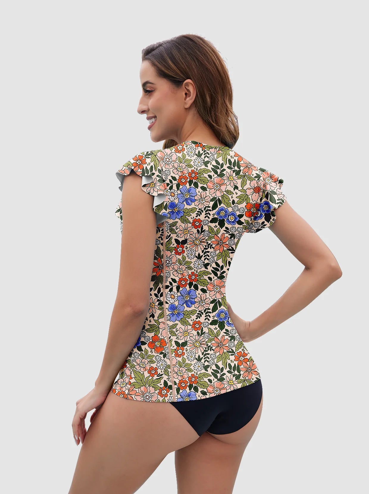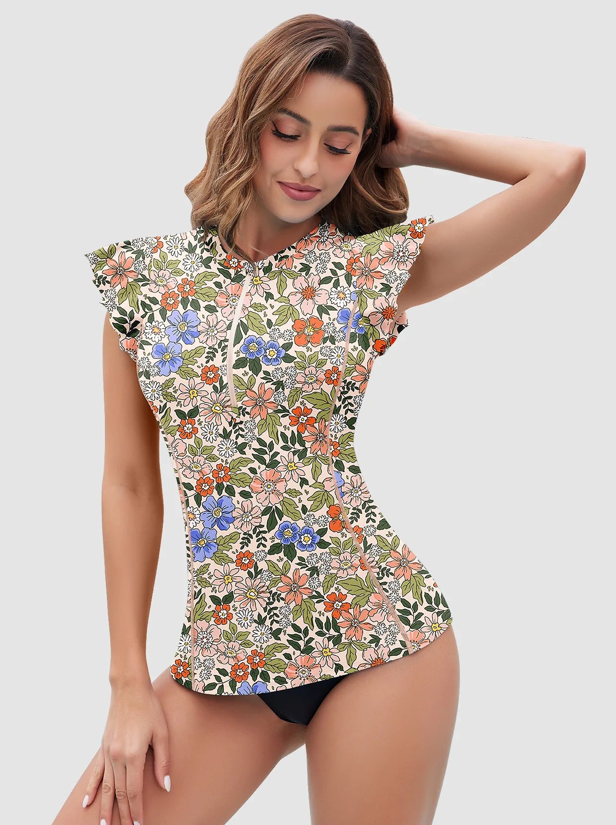 Get ready to make a splash with our floral print ruffle-sleeve rash guard! Made from quick-dry, breathable fabric with 4-way stretch, it's perfect for all your surfing, beach, and outdoor adventures. Plus, the ruffle sleeves and quarter-zip collar add a playful touch to your swimwear game. Don't just blend in with the waves, stand out in style!