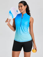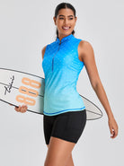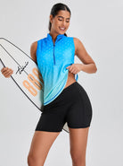 Blue Gradient Print Quarter-zip Sleeveless Rash Guard For Women