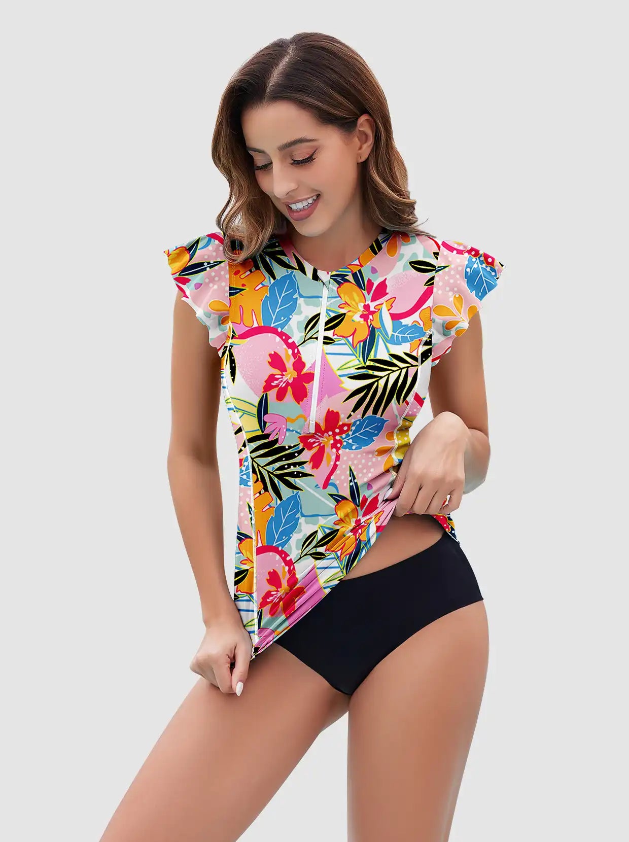 Elevate your aquatic wardrobe with our Floral Ruffled Sleeveless Rash Guard. This quarter-zip piece offers UPF 50+ protection, a streamlined silhouette with built-in bra support, and elegant ruffled details. The quarter-zip design and 4-way stretch fabric ensure comfort and mobility, while moisture-wicking properties keep you dry during beach outings, surfing adventures, or outdoor gatherings.