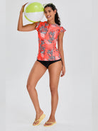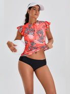 Orange Leaves Quartetzip Ruffled Sleeveless Rash Guard For Women