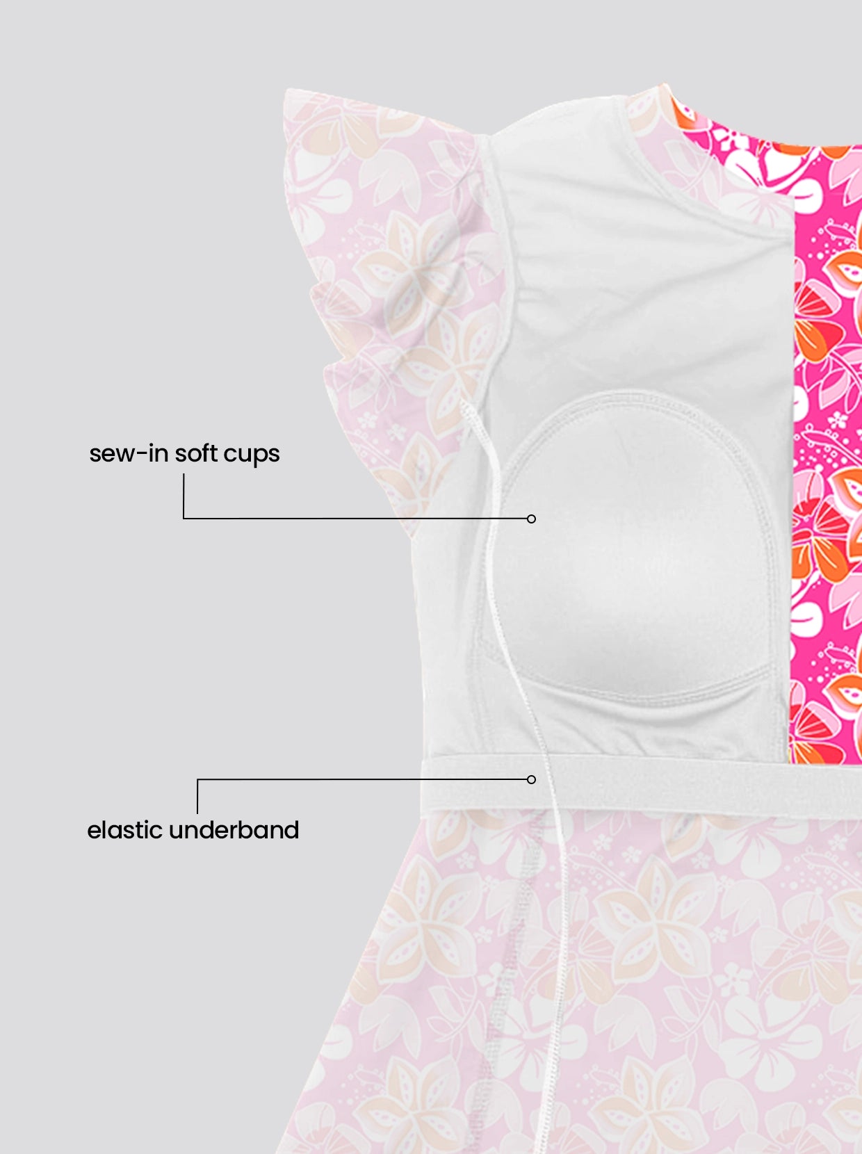 - Sewn-in cups offer added coverage.