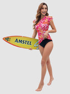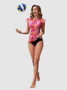 Rose Red Floral Ruffled Sleeveless Rash Guard with Bulit-in Bra