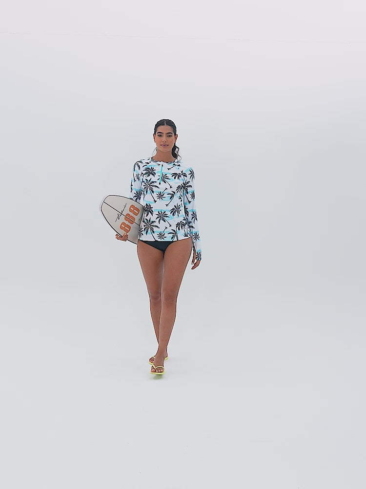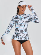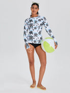 Embrace the tropical vibes with our coconut tree long-sleeve rash guard. Designed for maximum sun protection, our rash guard features long sleeves and a thumbhole design to shield your skin from harmful UV rays. The quarter-zip closure allows for easy on/off and temperature regulation. Made from soft, breathable fabric, it keeps you cool and comfortable during all your water adventures.