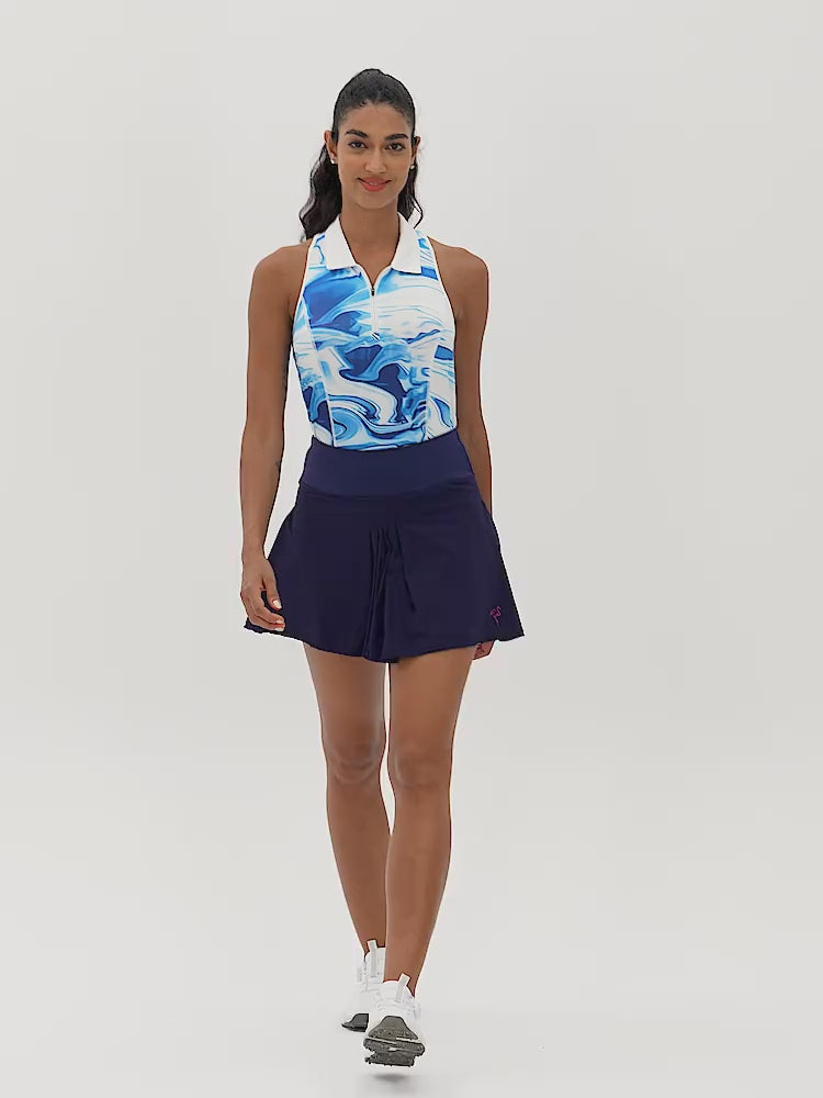 Experience cool comfort and dynamic style with this 16" navy skort from our Ocean Breeze Collection. Designed with front pleats inspired by gentle sea breezes, it offers a unique visual flow. Made from breathable, lightweight nylon and featuring an elastic waistband and pockets, it's designed for unrestricted movement and confident performance during all your summer activities.
