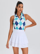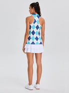 Define your game with our blue checkerboard V-neck racerback polo shirt. Sporting a bold blue and white checkerboard pattern, it marries sporty chic with practical performance. The racerback design boosts mobility, while the sleeveless cut keeps you cool. With convenient pockets, it's ideal for golf, tennis, pickleball, or summer fun, ensuring comfort and a sharp look.