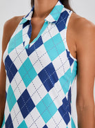 Blue Checkerboard V-neck Racerback Sleeveless Polo Shirt with Pockets