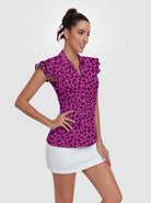Experience unparalleled comfort and style with our Purple Leopard Ruffled Sleeveless Polo Shirt. Made with moisture-wicking, breathable, and soft material, our shirt will keep you comfortable and dry throughout all your favorite activities, including golf, tennis, pickleball, and daily wear. The V-neck collar and ruffle sleeves add a touch of femininity and charm, making this shirt perfect for sporty and casual looks.