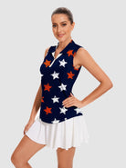 Effortlessly stylish and comfortable, this V-neck sleeveless polo shirt is perfect for your outdoor activities. Made with quick dry and breathable material, our sleeveless polo keeps you dry and cool. The 4-way stretch fabric allows maximum flexibility and movement, making it ideal for golf, tennis, pickleball, and any celebration. The eye-catching star print on a blue background adds a touch of playfulness to the classic design. Plus, with snap fasteners and a soft, curved hem, our polo top is convenient and flattering.
