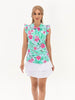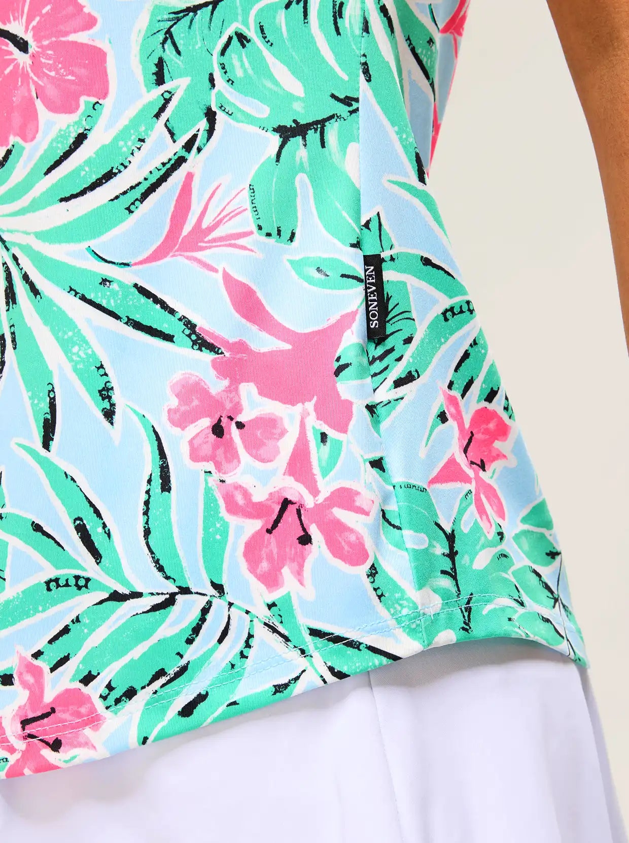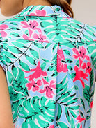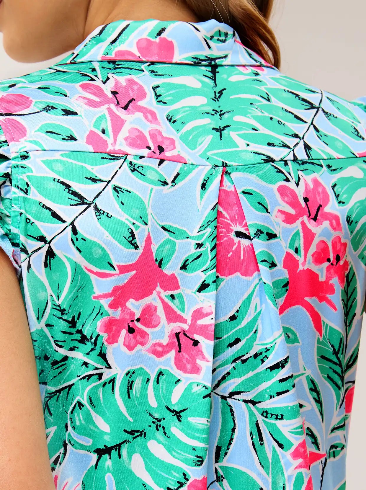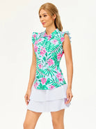 Tropical Flower Button-placket Ruffled Sleeveless Polo Top