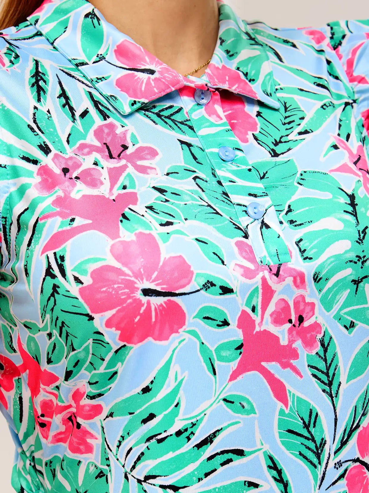 Step up your fashion game with our Tropical Flower Button-placket Ruffled Sleeveless Polo Top - ideal for sports and everyday wear! Made of fast-drying, moisture-wicking fabric, this top is essential for any daring lifestyle. With its flexible material, you'll be comfortable all day long, and the floral design and frilly sleeves add a hint of adventure to any ensemble.