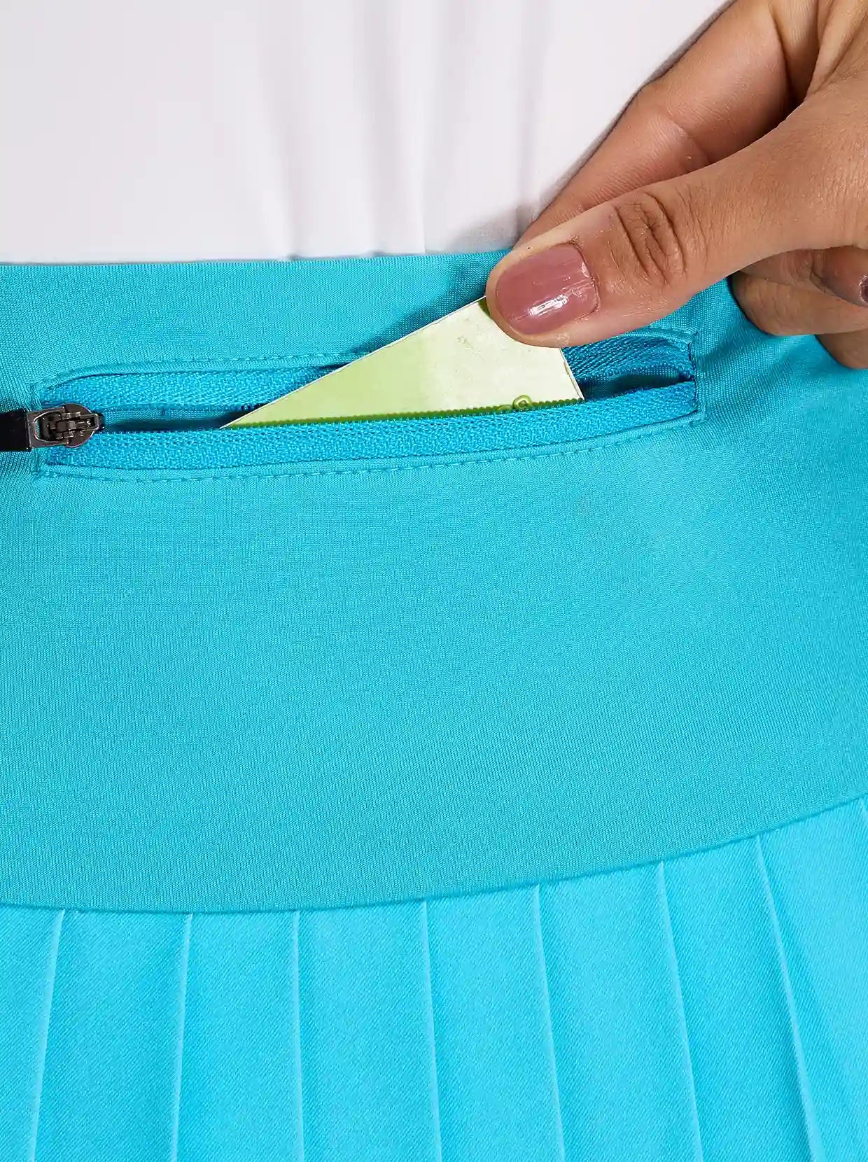 Designed for activity and style, our high-waisted pleated active skort features gentle tummy control and built-in shorts for worry-free coverage. The flowy, water-repellent fabric keeps you comfortable on the court or course. A convenient back zipper pocket holds small essentials. Perfect for tennis, golf, or daily wear.