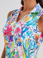 Embrace vibrant confidence with our Colorful Seagrass V-neck Sleeveless Polo Shirt from our Ocean Breeze Collection. Crafted from breathable, stretchy fabric, its flattering V-neck design empowers graceful movement and personal style. The print, inspired by vivid corals, glowing underwater worlds, and luminous jellyfish, features bright and fluorescent hues that make a striking statement, reflecting your unique energy and flair.
