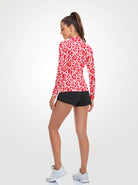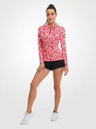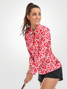 Add a touch of sweetness to your wardrobe with our heart-adorned quarter-zip polo. Our polo top features a breathable, moisture-wicking fabric that keeps you cool and dry. The stretchy material provides unrestricted movement, while the quarter-zip design allows easy temperature regulation. The classic polo design and heart pattern make it perfect for outdoor sports and daily wear.
