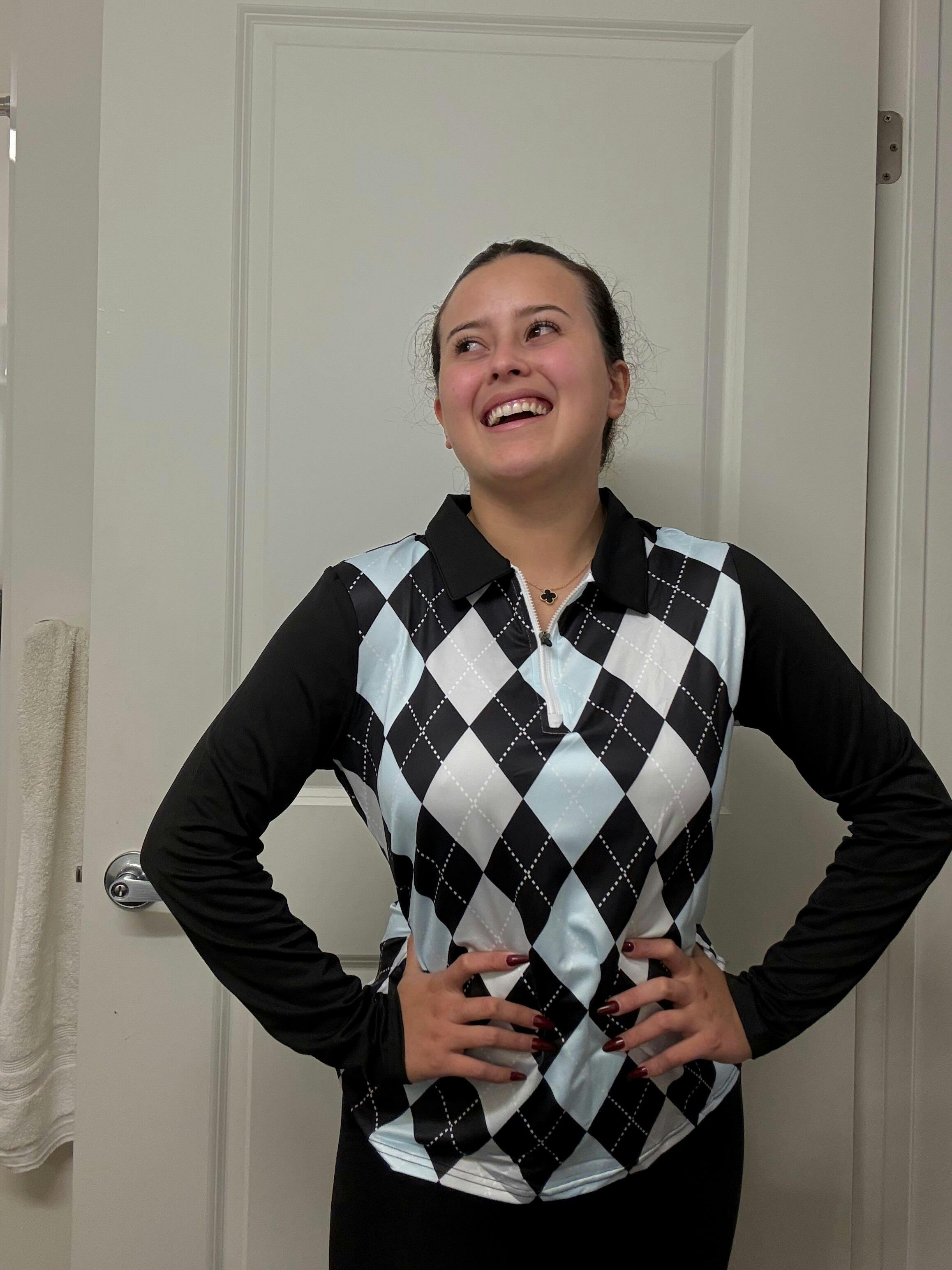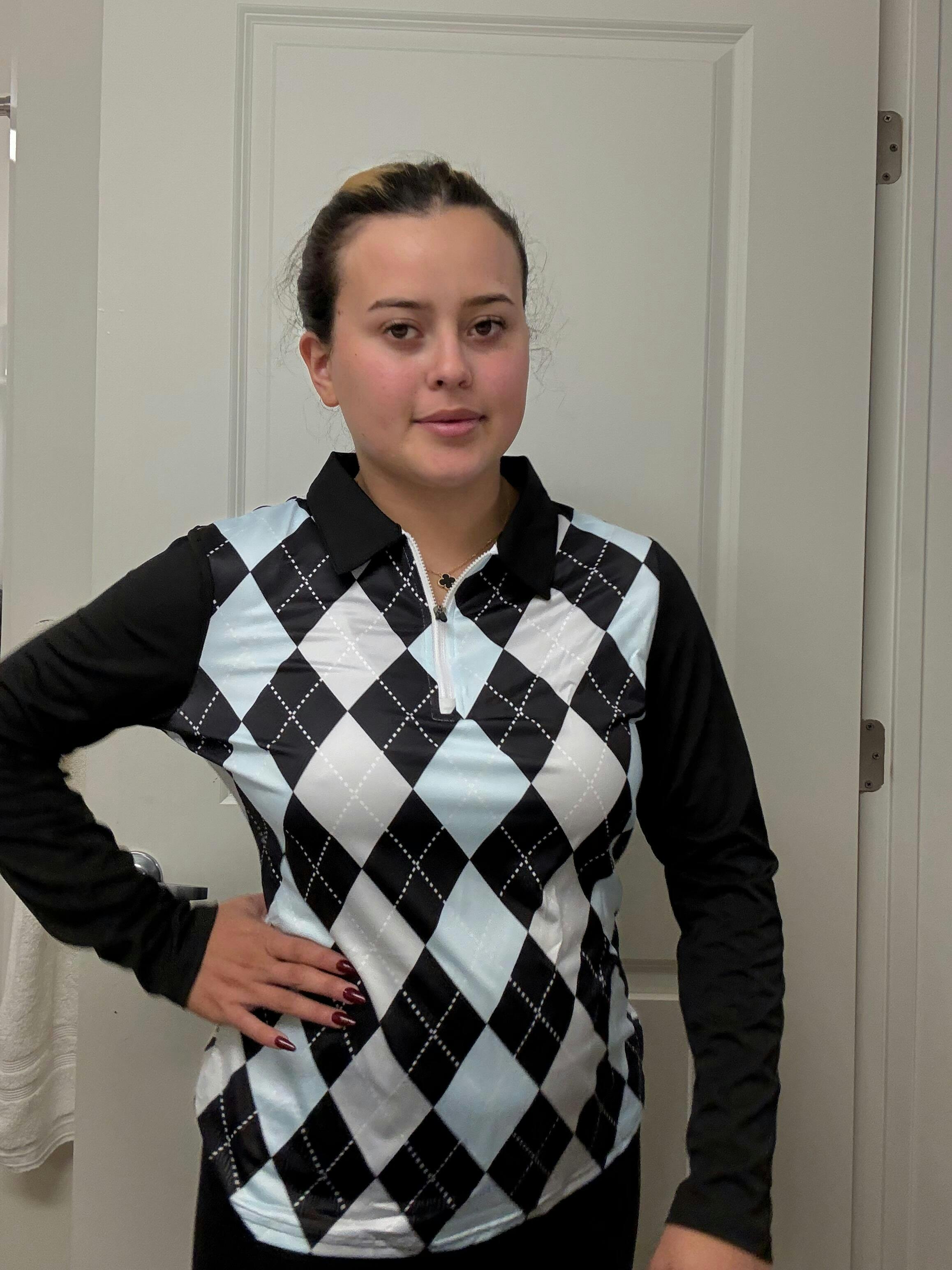 Step up your style game with our Styled White and Blue Argyle Long-Sleeve Polo Top for Ladies. Crafted from soft, breathable fabric. The classic lapel and trendy checkerboard pattern make it a standout piece for both casual outings and golf days.