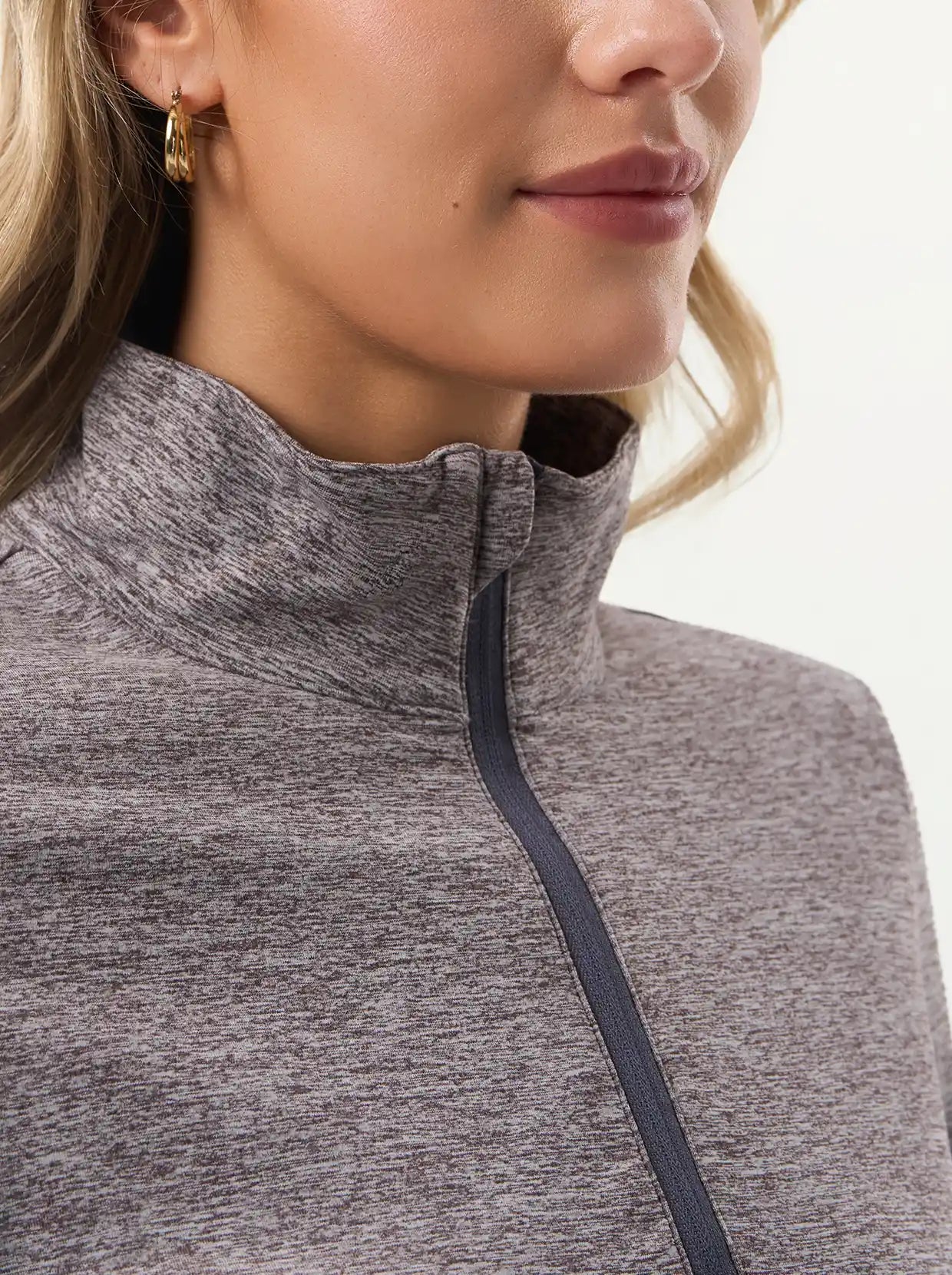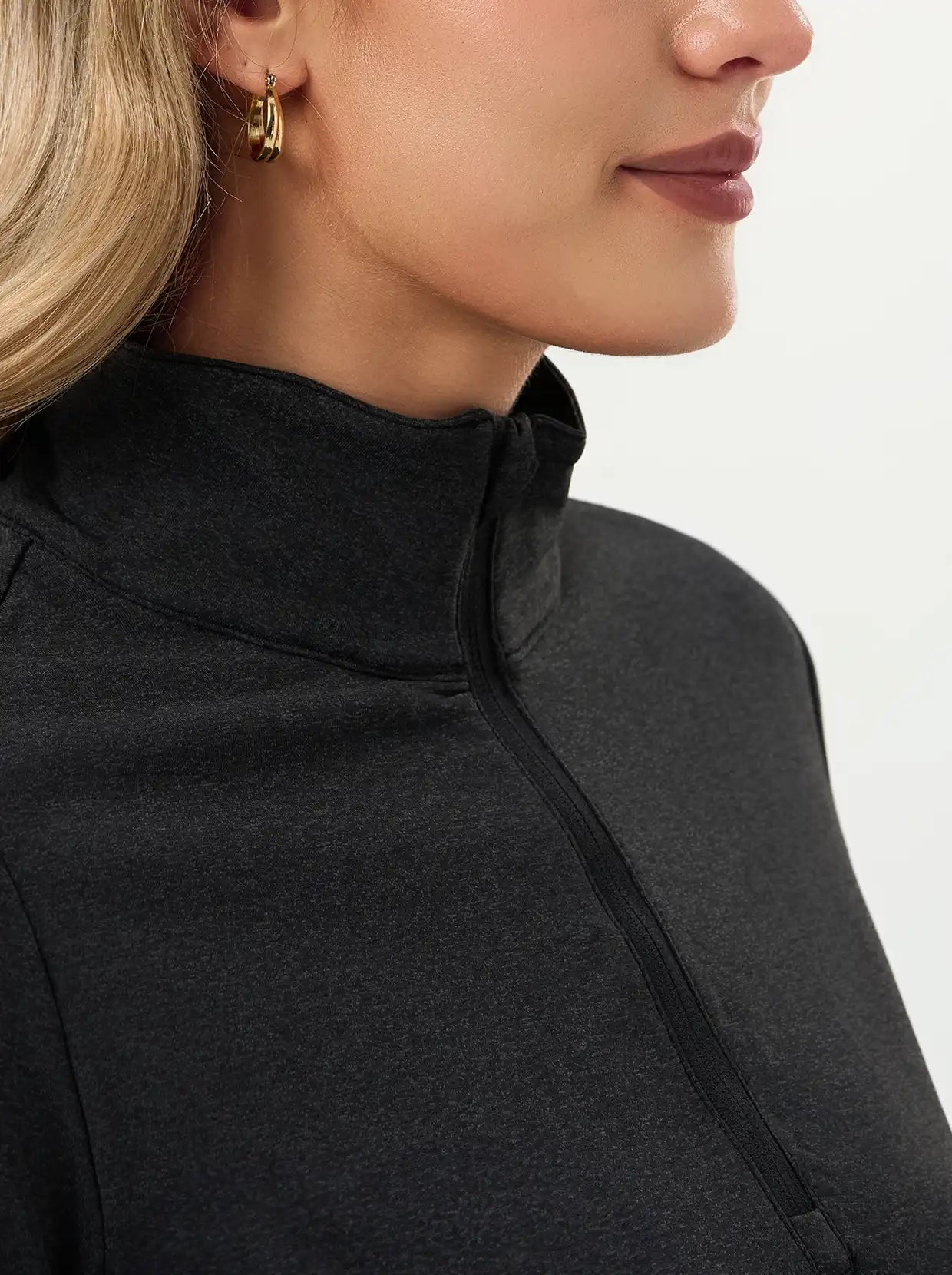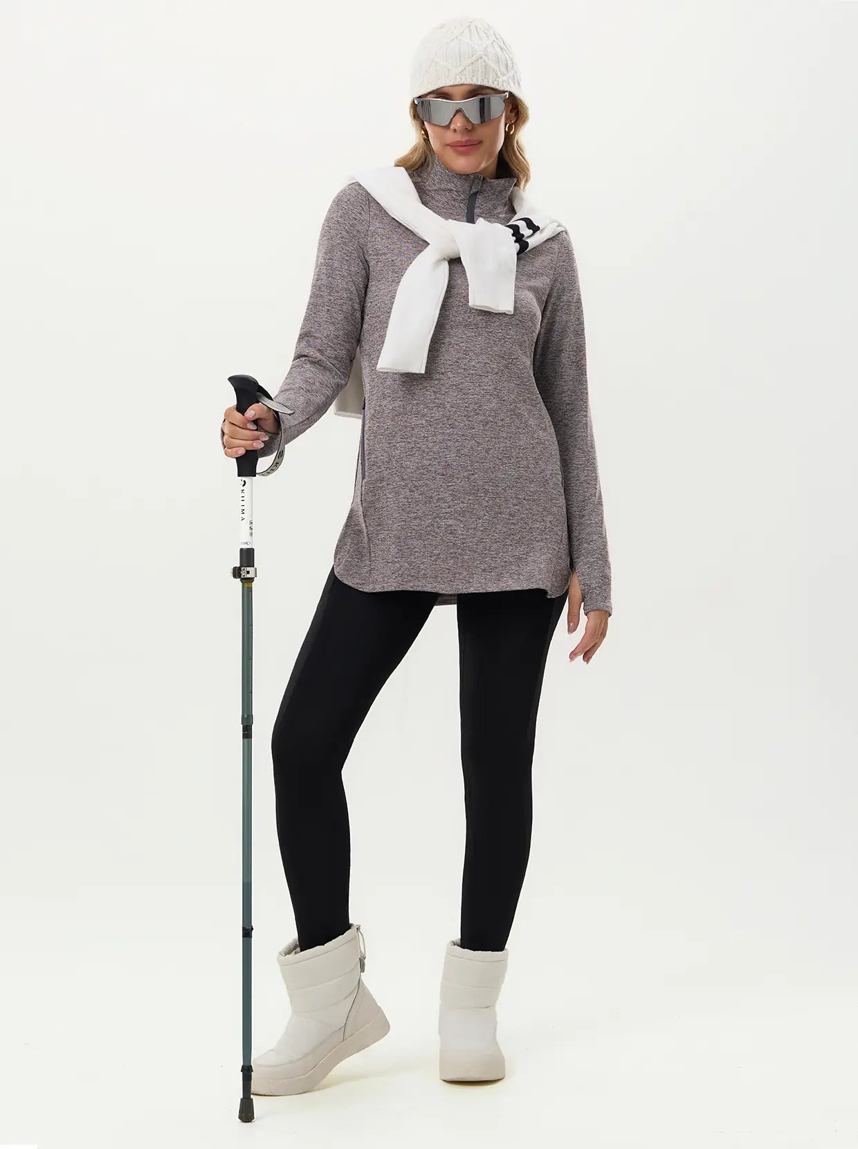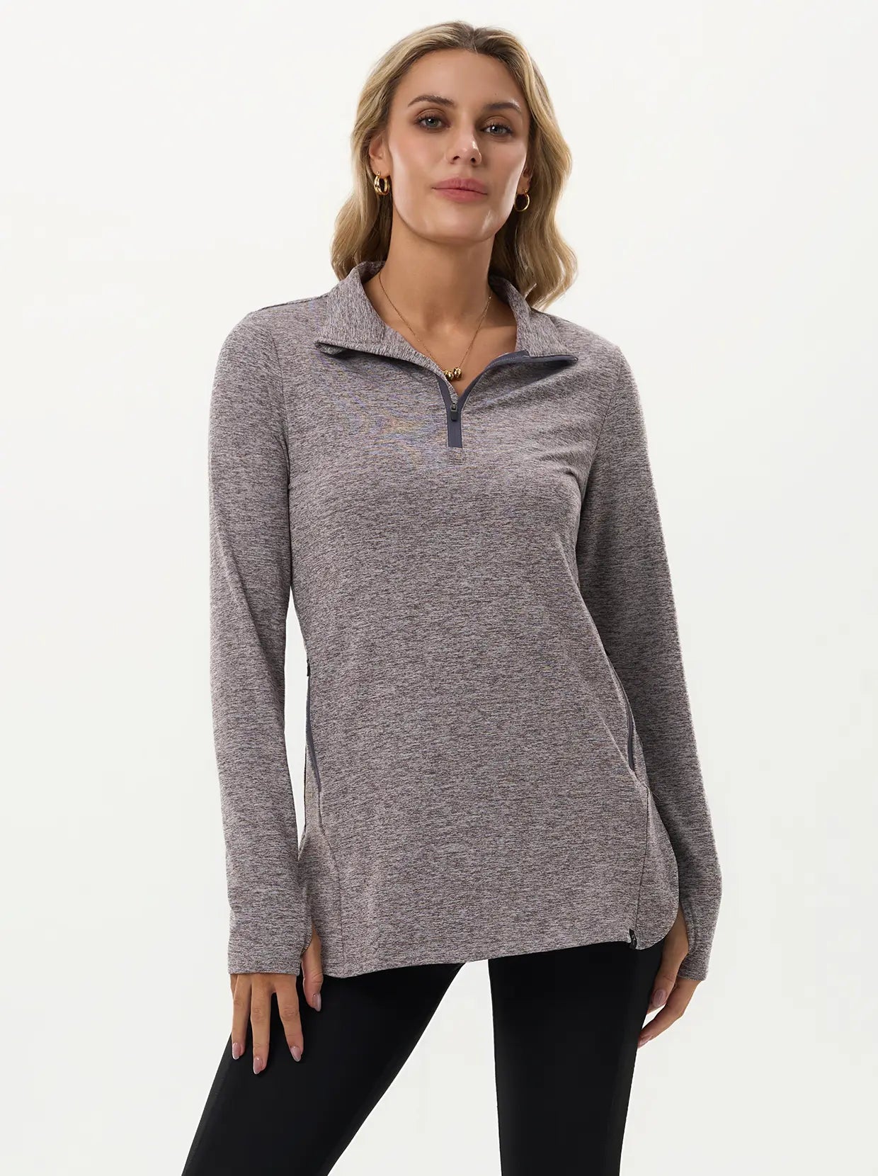 Quarter-zip Long-sleeve Thermal Tops with Curved Split Hem