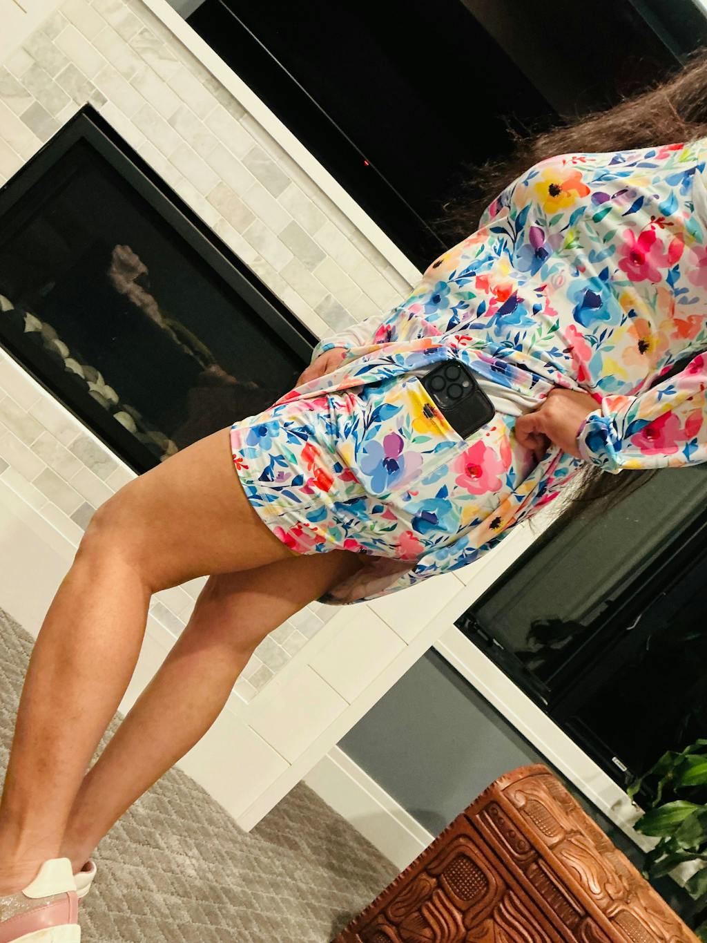 The pattern is super cute and bright — perfect for warm weather days. The fabric is really soft, and I love the mesh detail on the sleeves for a little extra breathability. The shorts do have one pocket (wish there were two), but overall the fit is comfy and flattering. I’m wearing a size large and could easily size down for a more fitted look. For reference: 5’4”, 160 lbs.