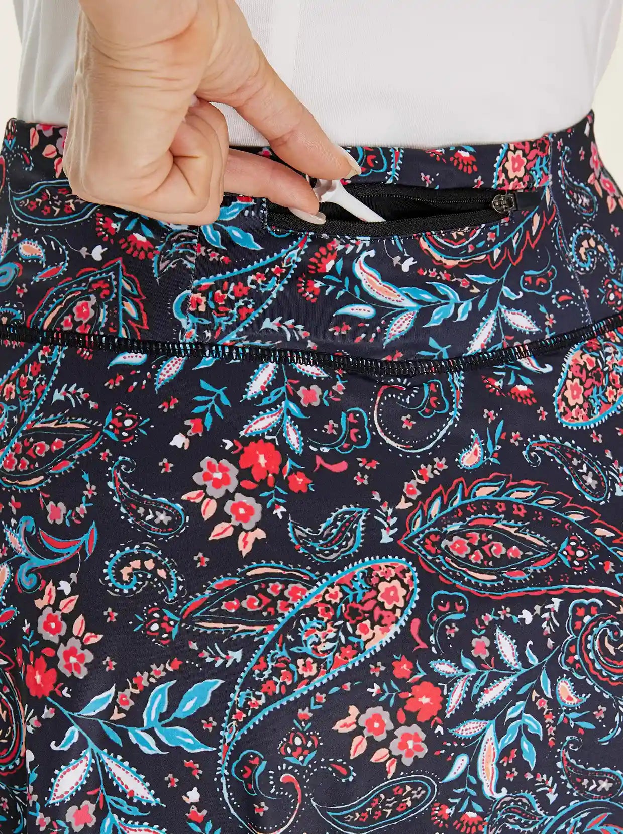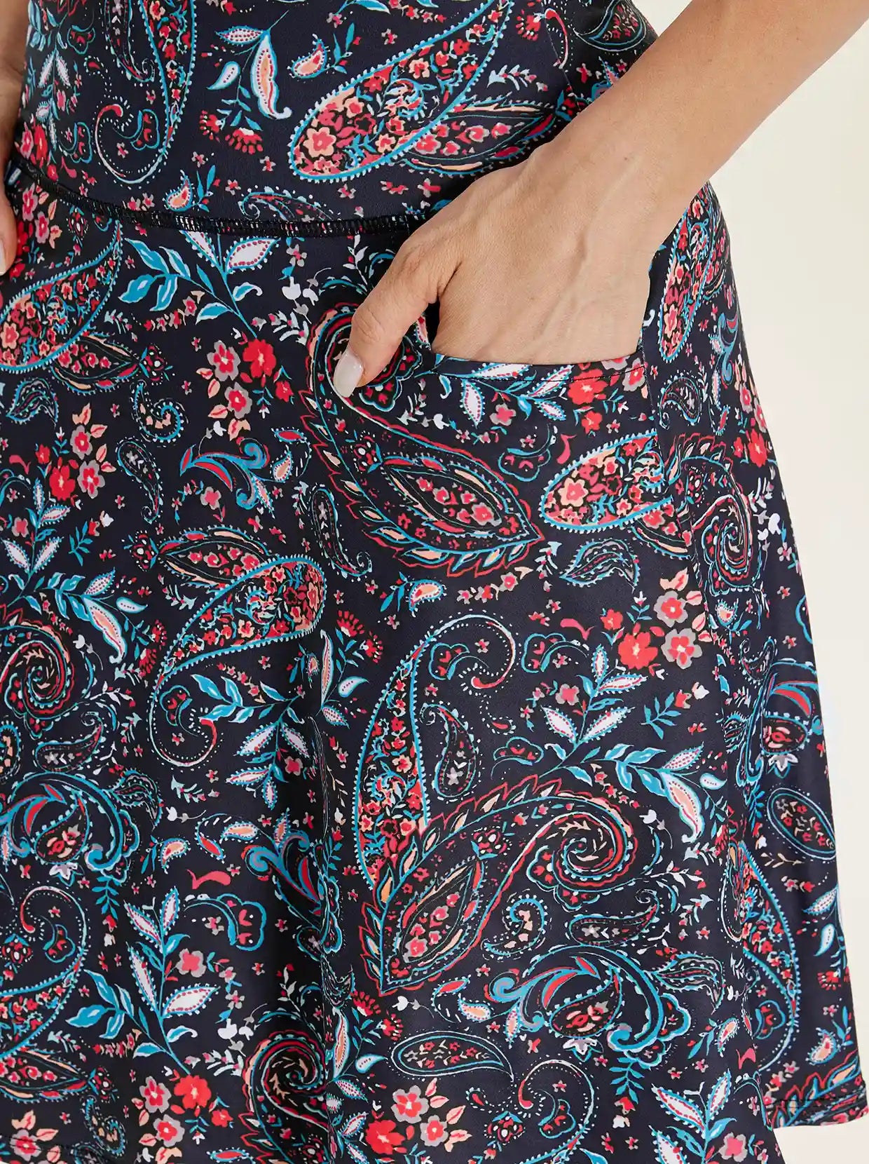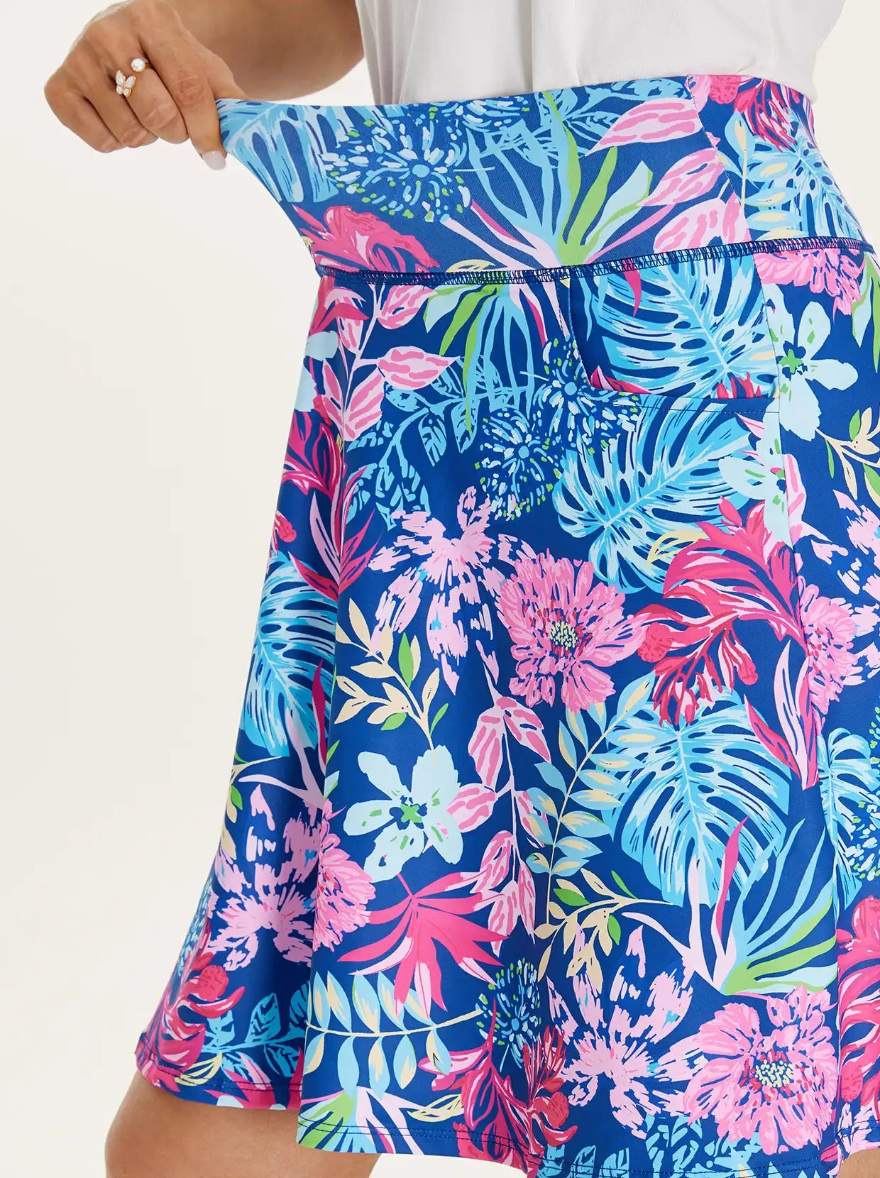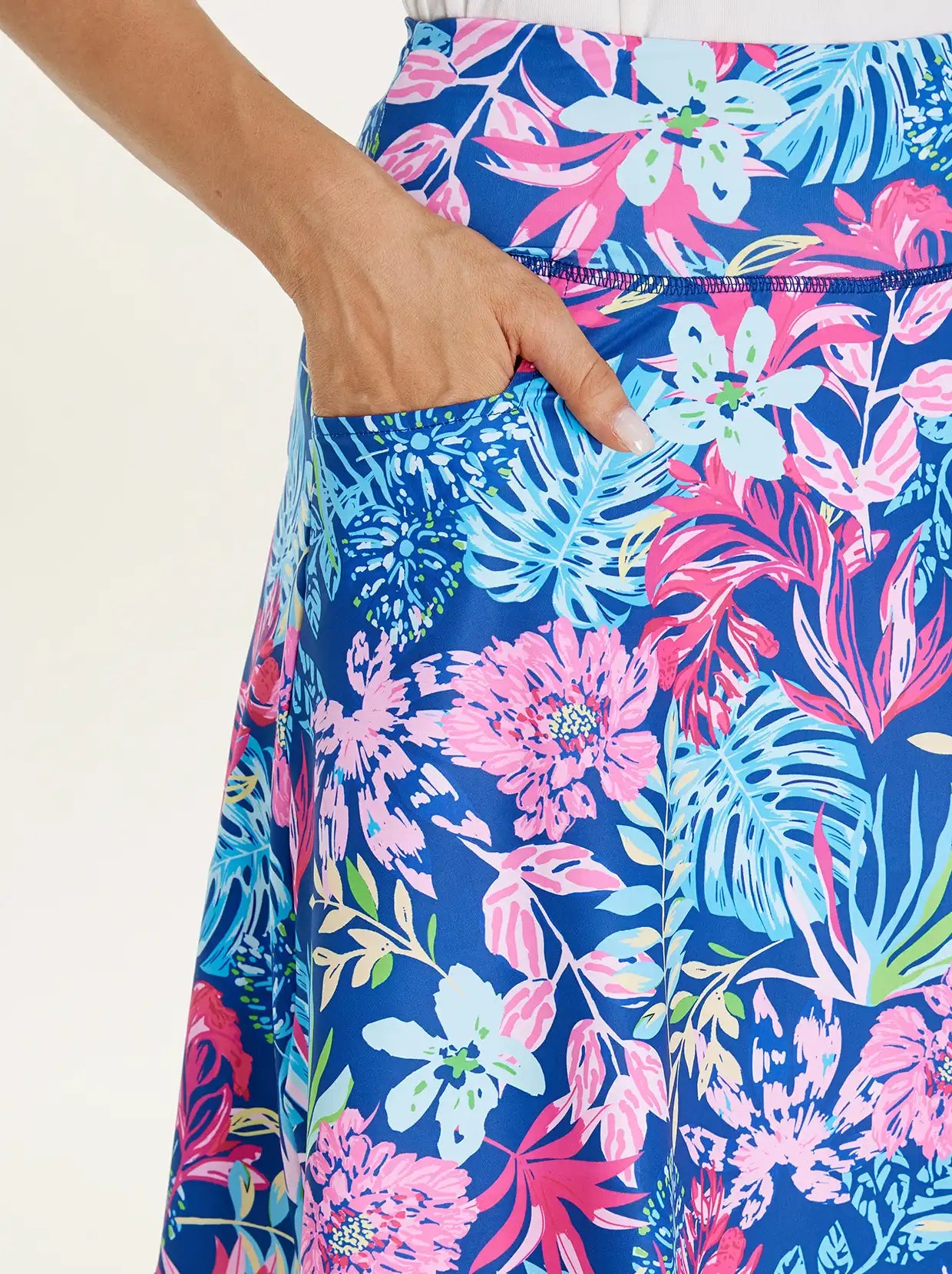 Highlights: A-line, side pockets & back zipper pocket, and high-rise wide elastic waistband